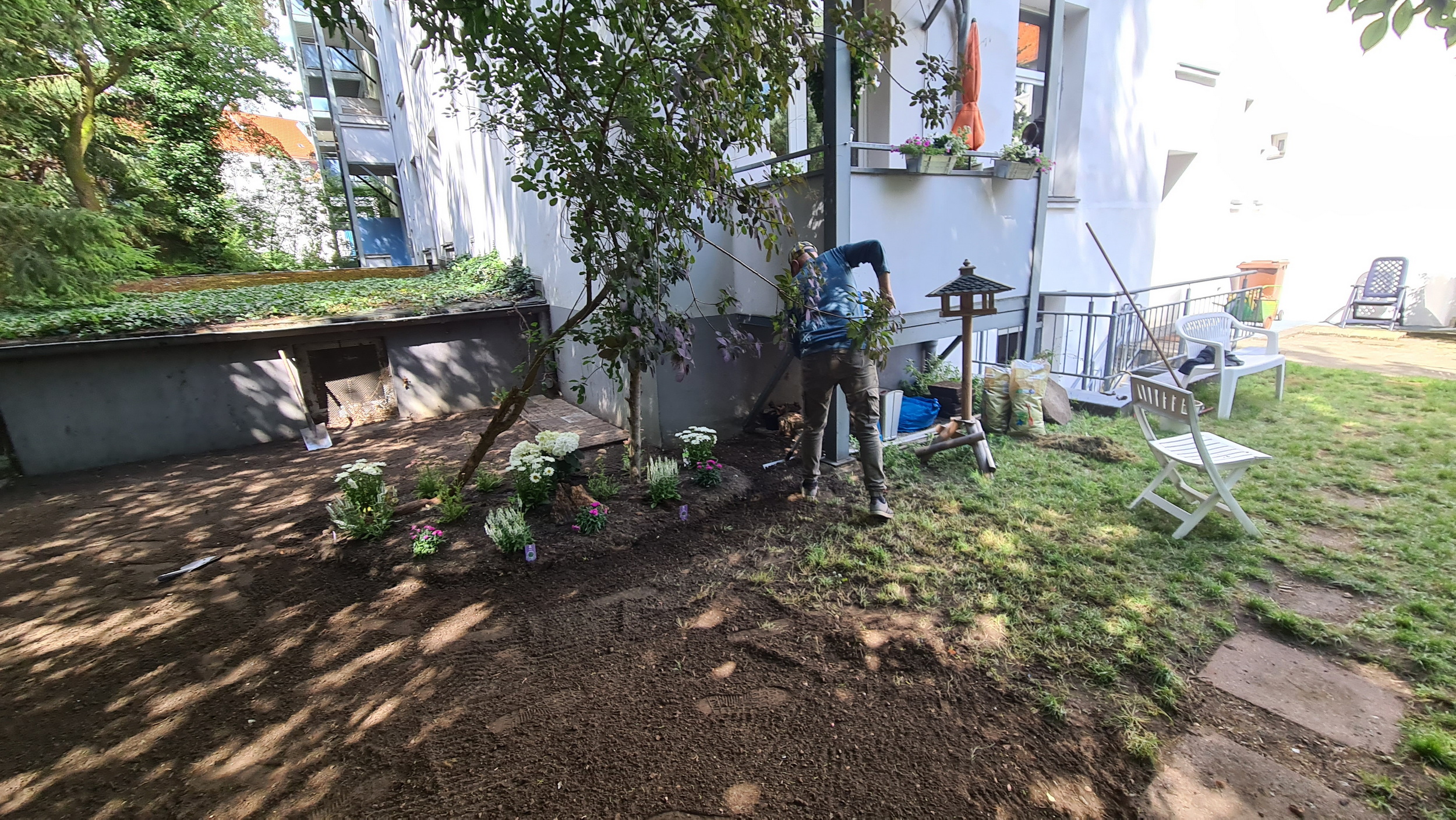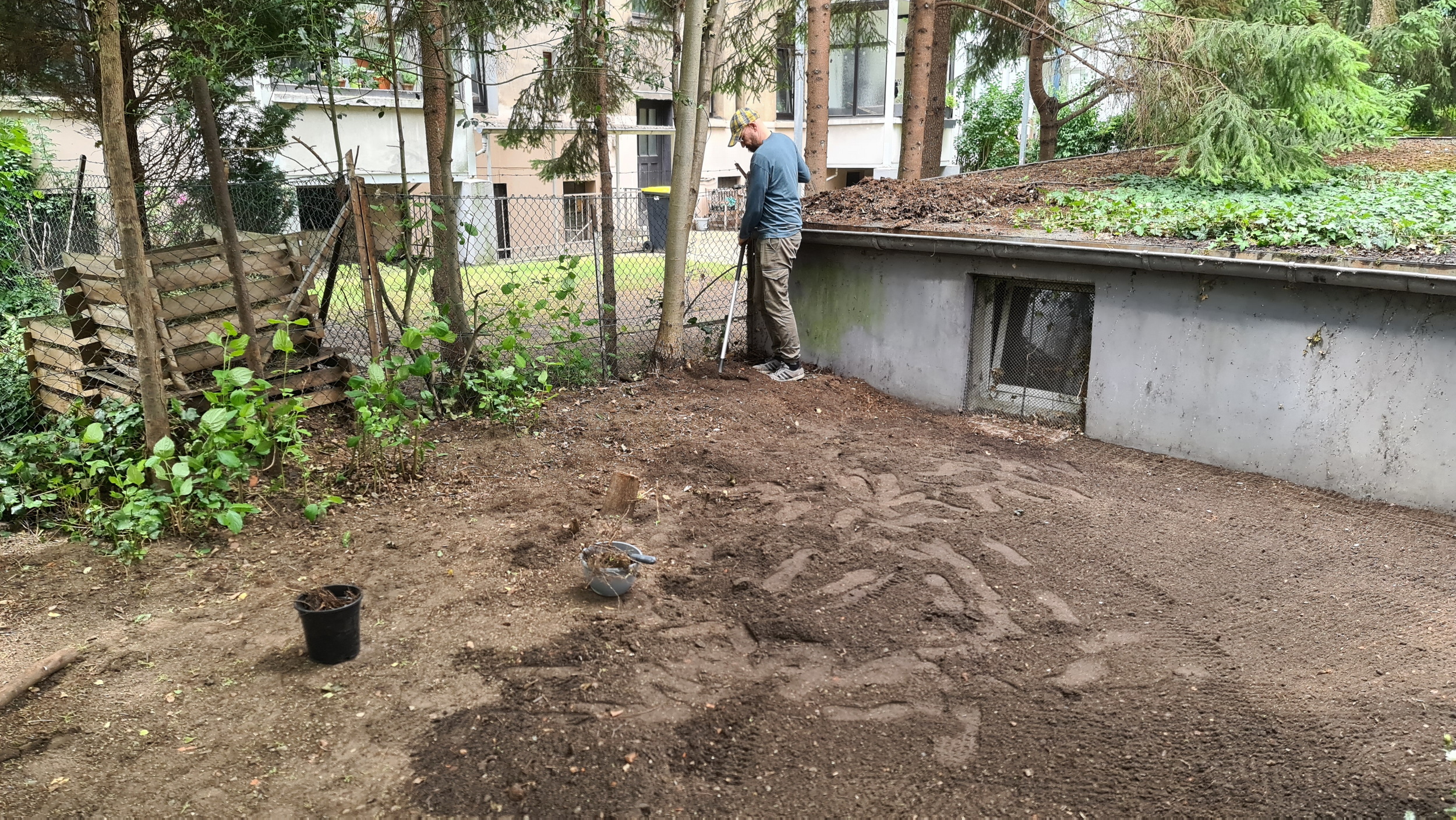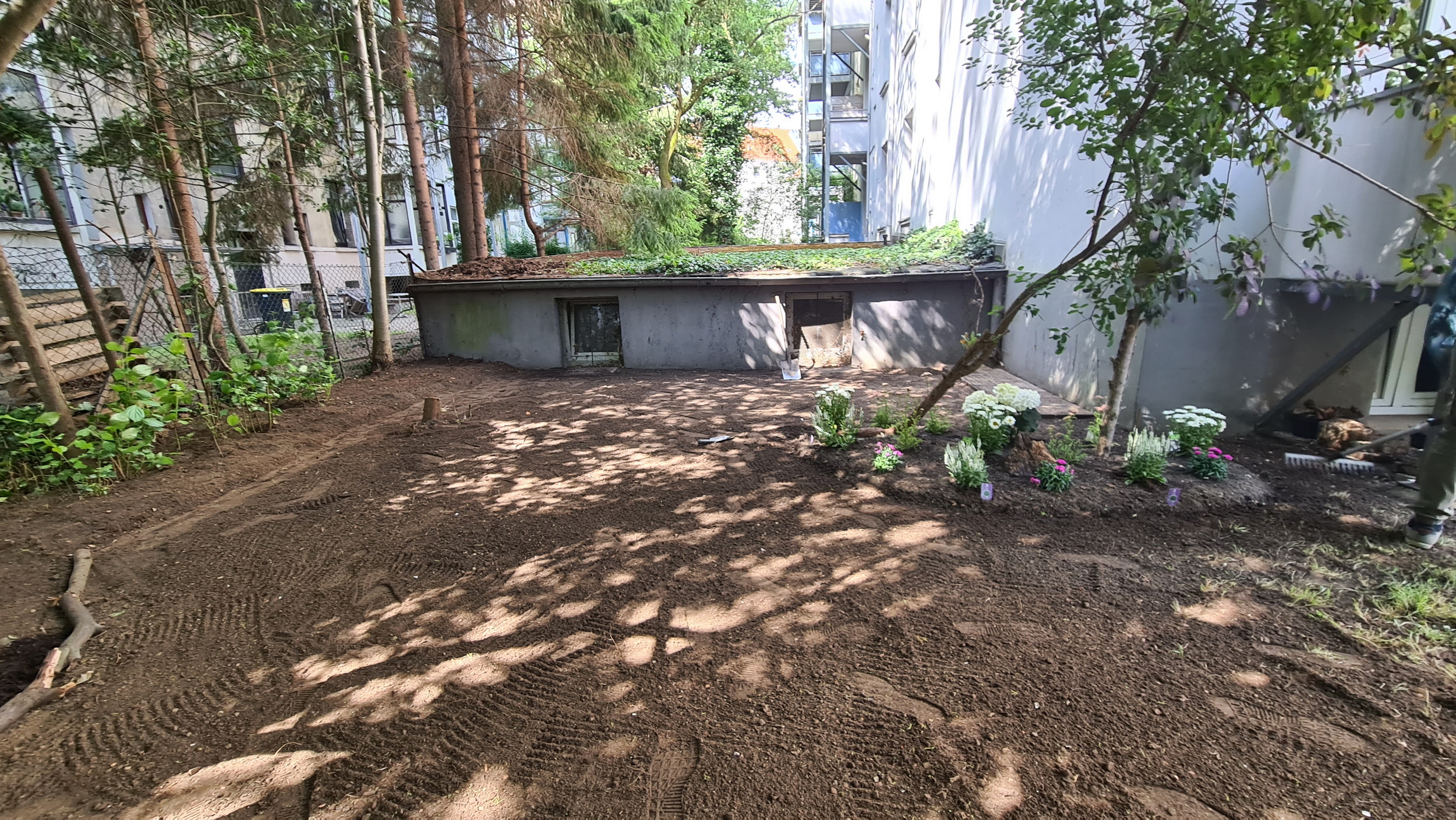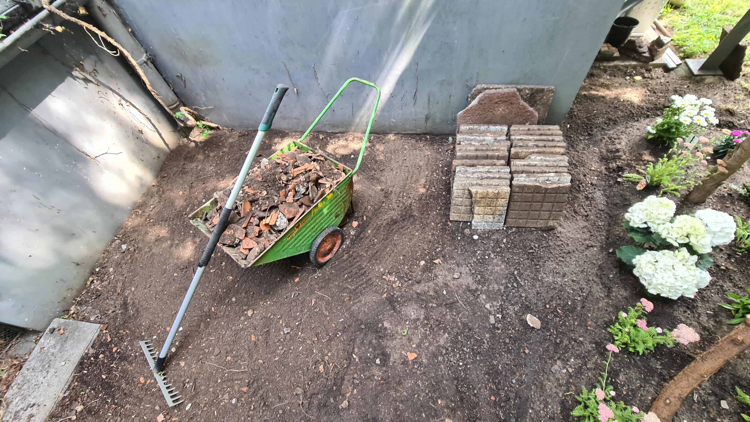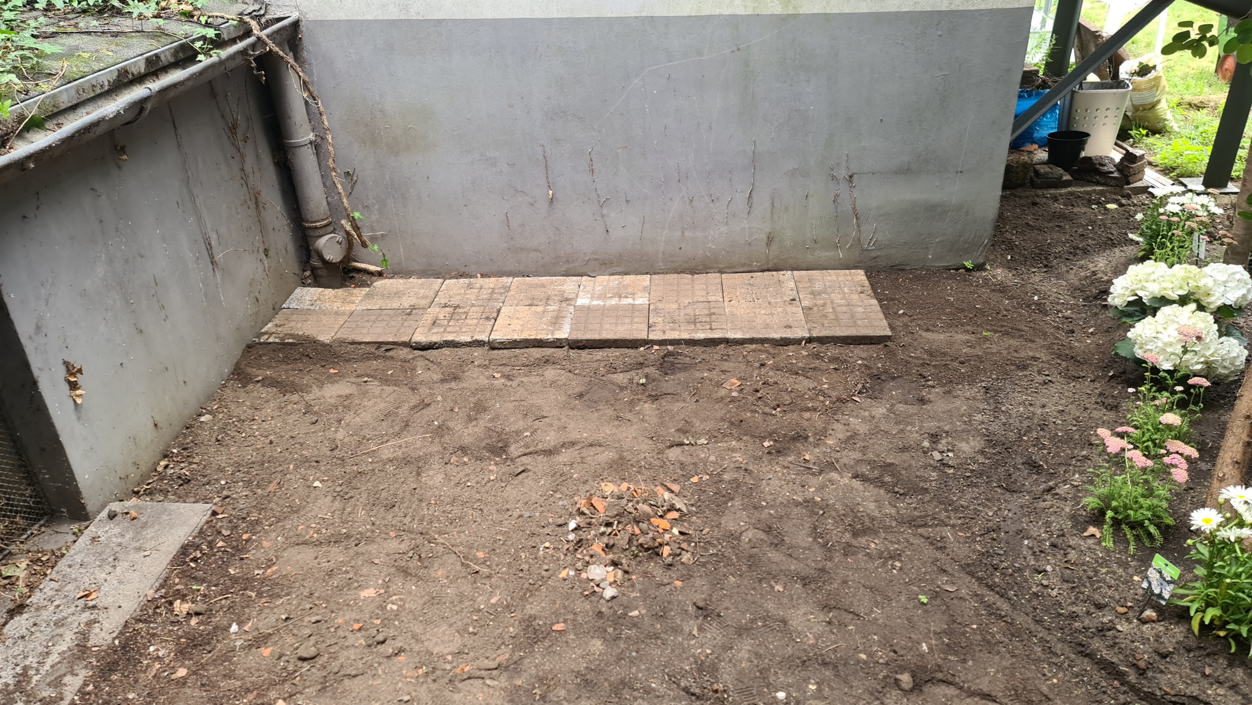 Nochmals Wurzeln und Steine entfernt, Platten verlegt, eingeebnet, geharkt, gewässert und zu guter Letzt den Rasen gesät.
