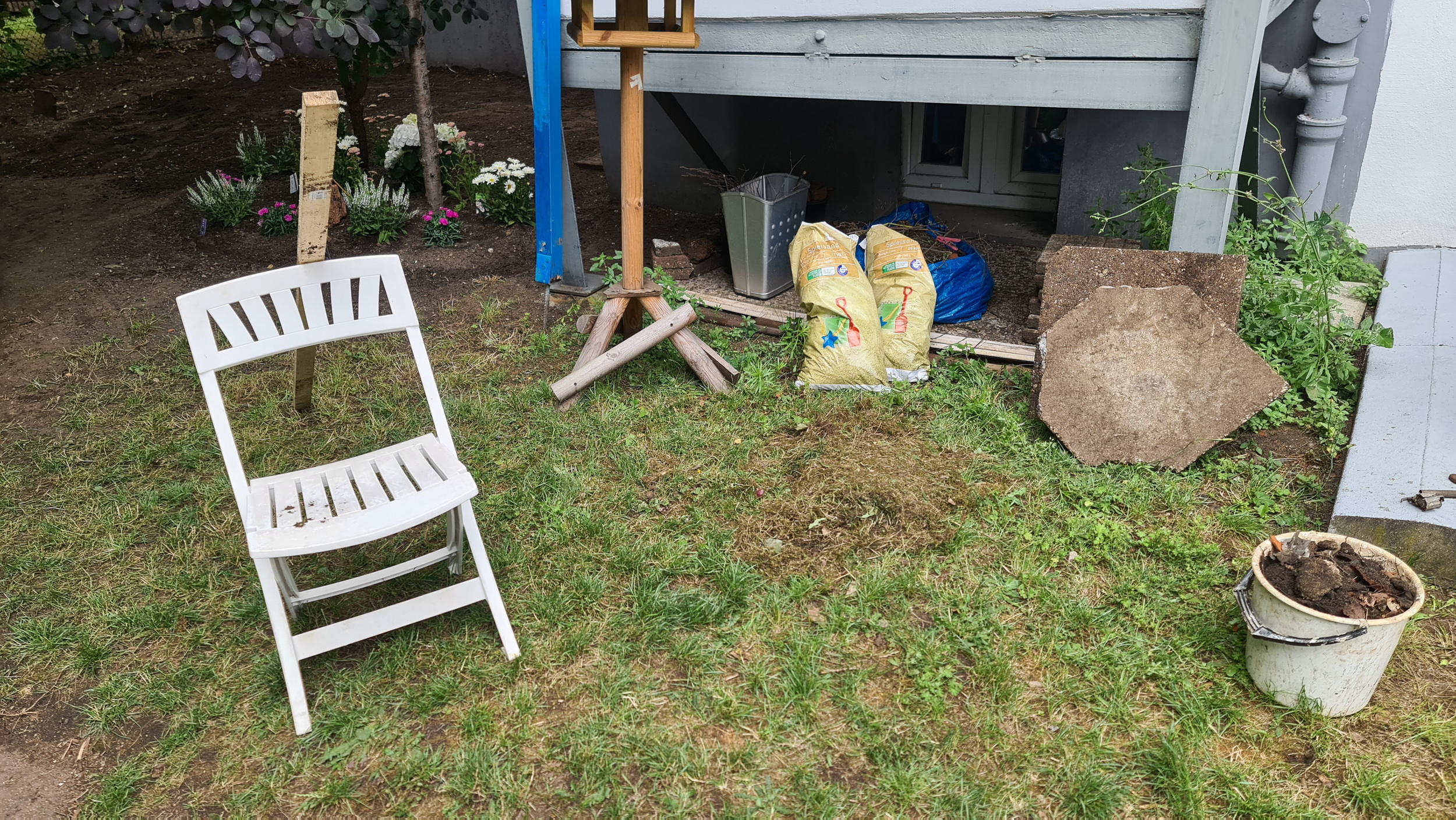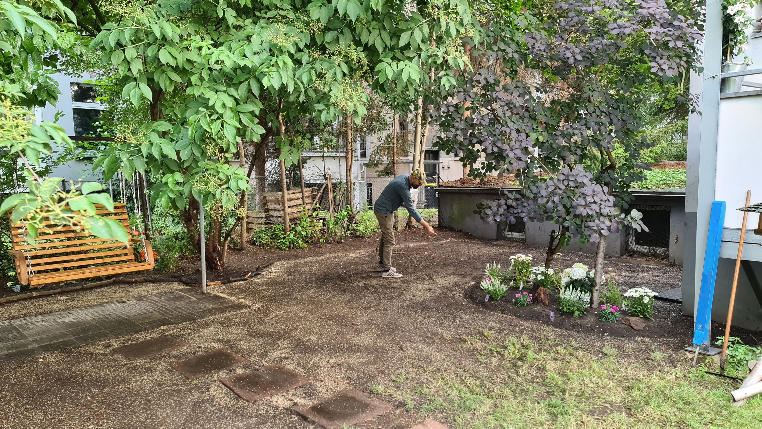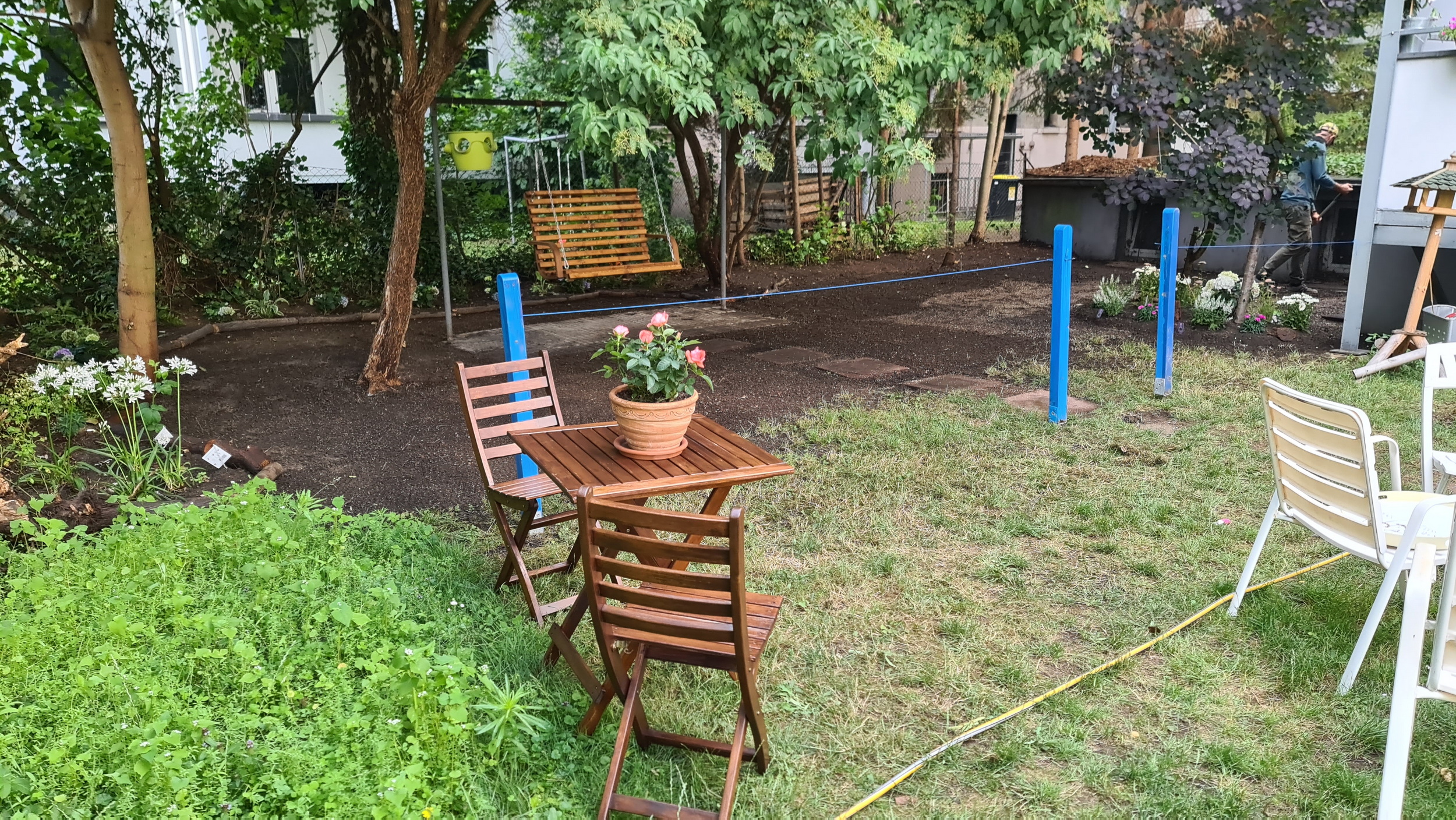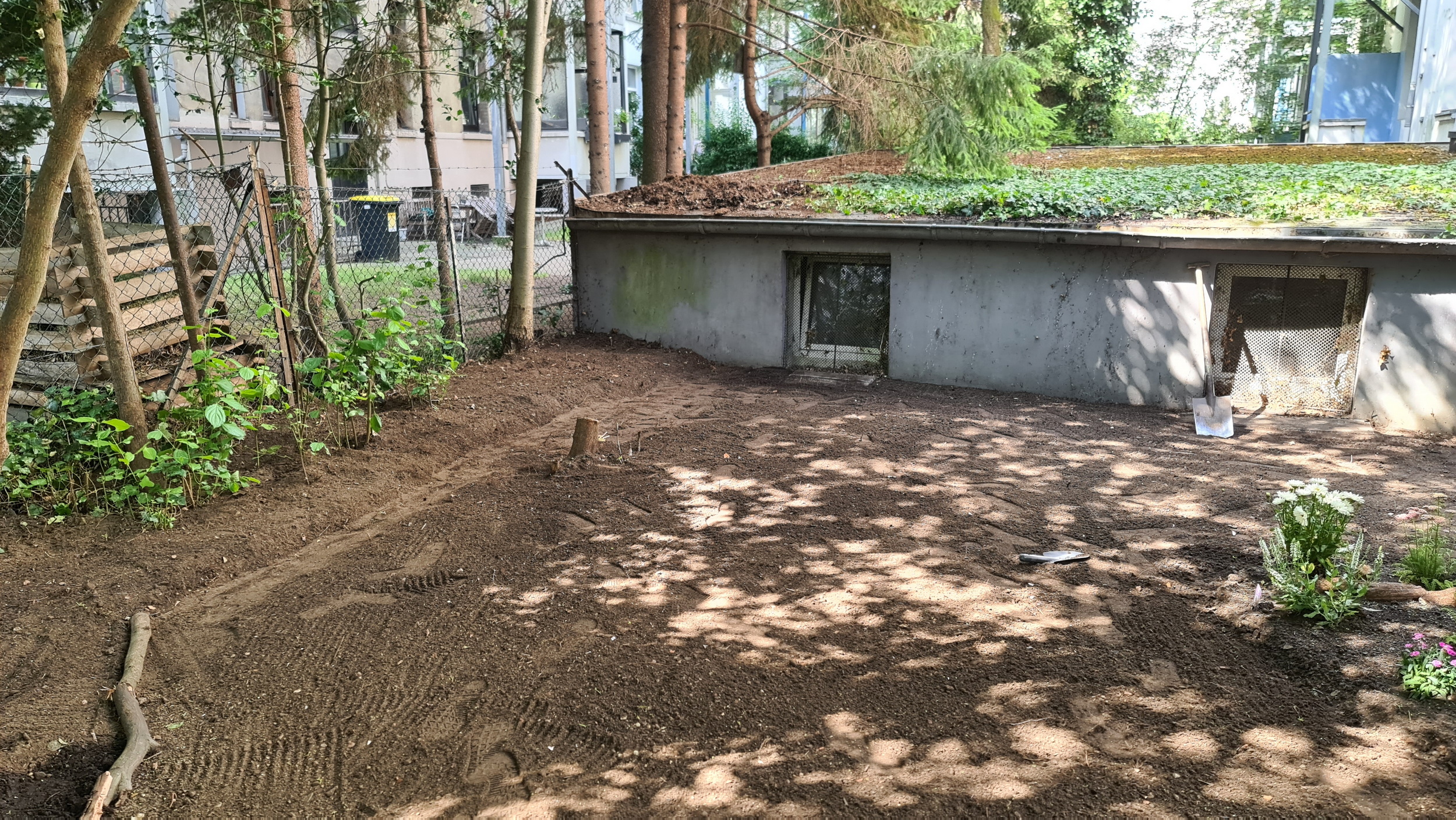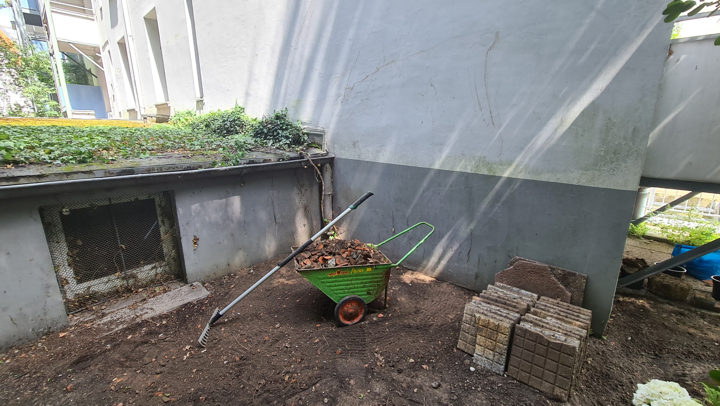 Nochmals Wurzeln und Steine entfernt, Platten verlegt, eingeebnet, geharkt, gewässert und zu guter Letzt den Rasen gesät.