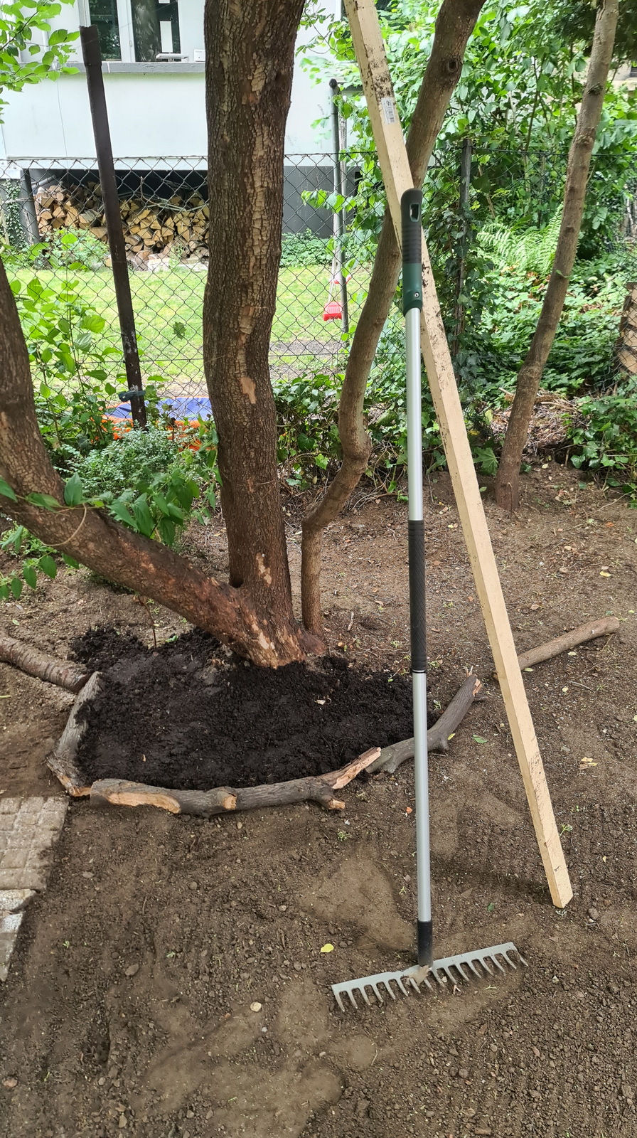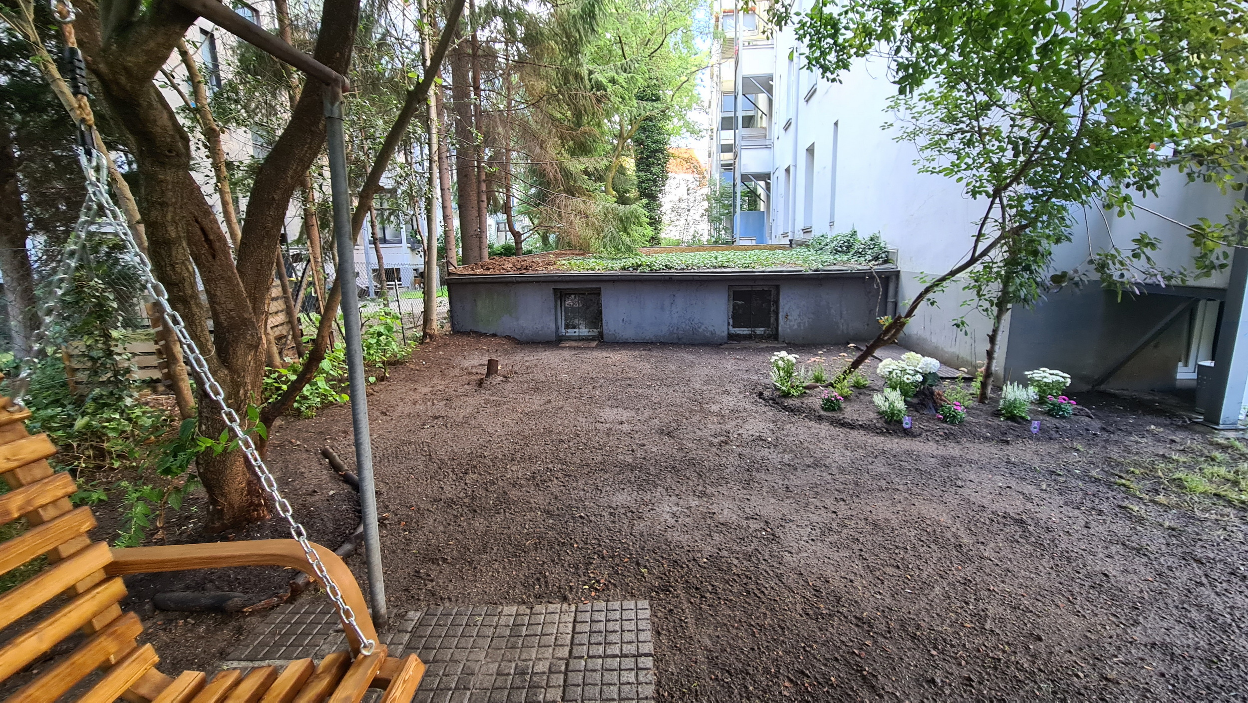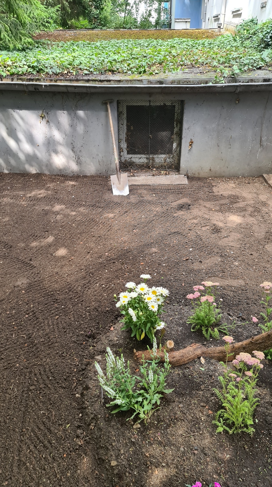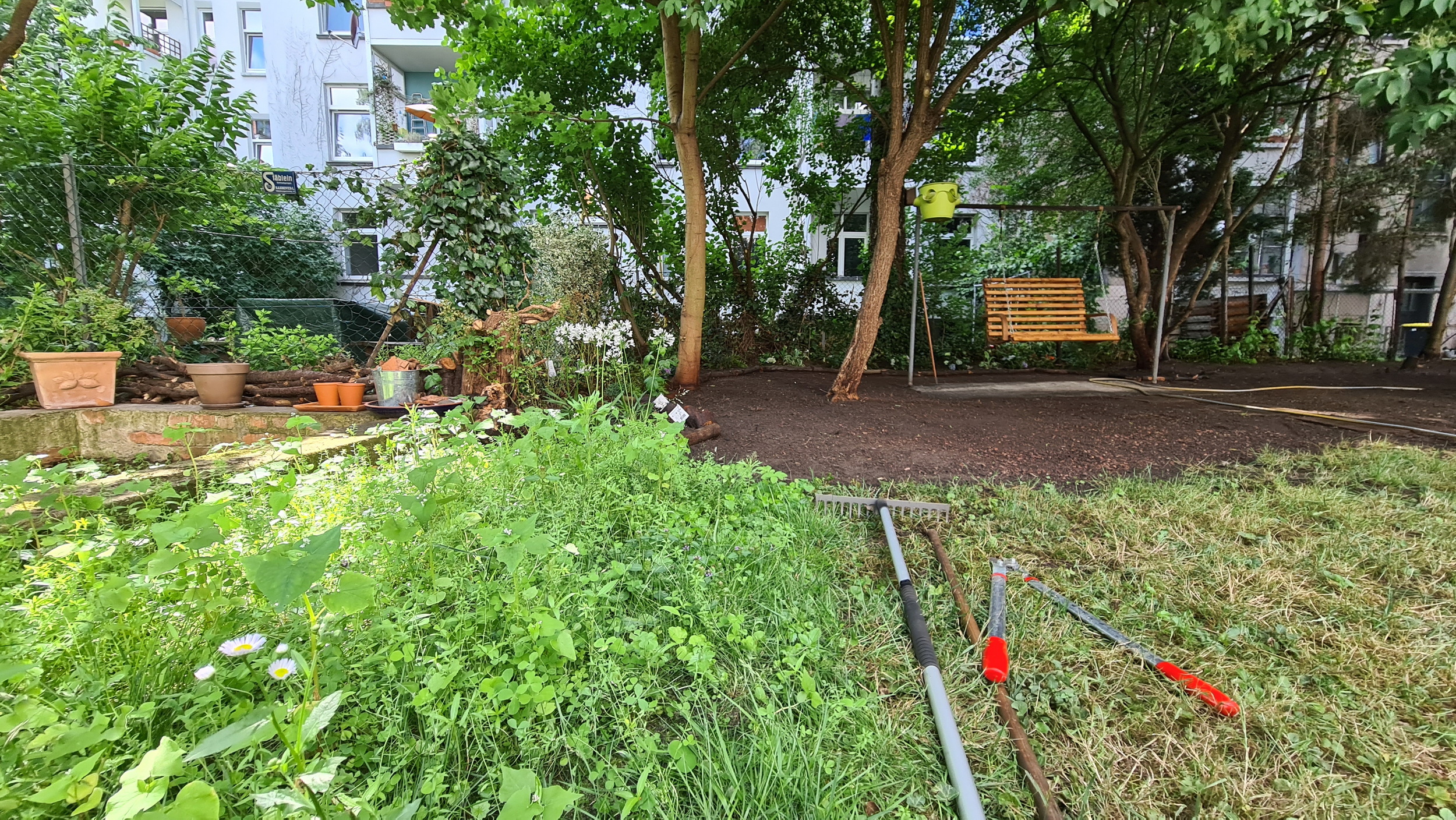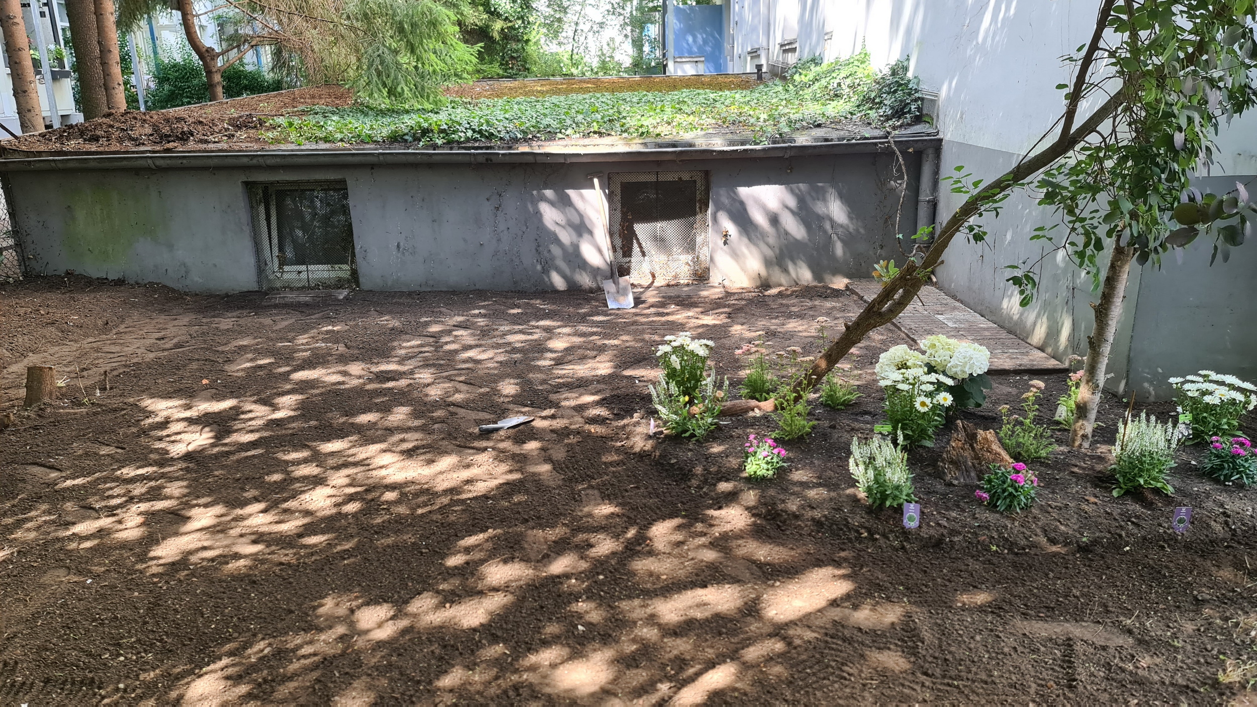 Nochmals Wurzeln und Steine entfernt, Platten verlegt, eingeebnet, geharkt, gewässert und zu guter Letzt den Rasen gesät.
