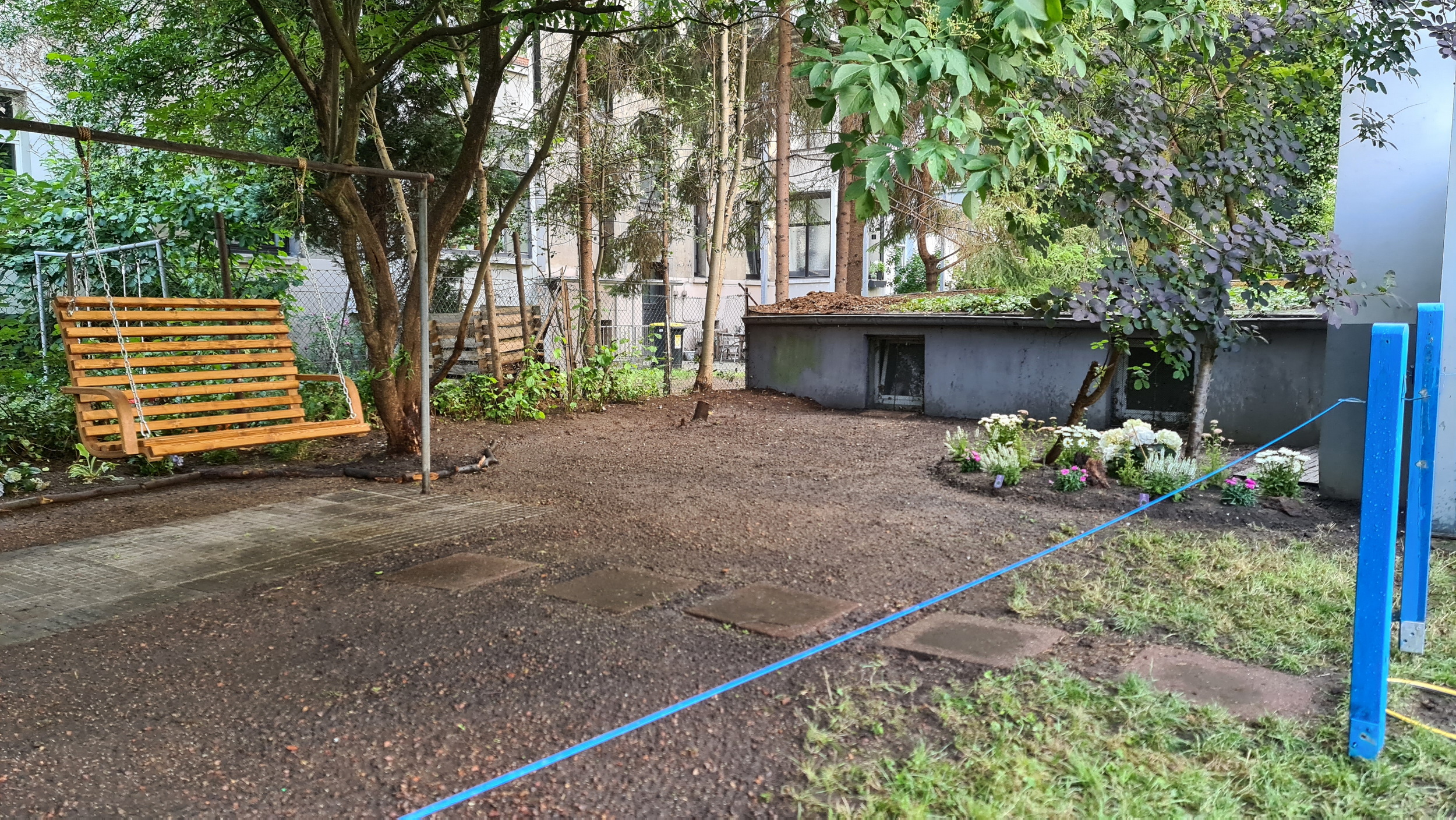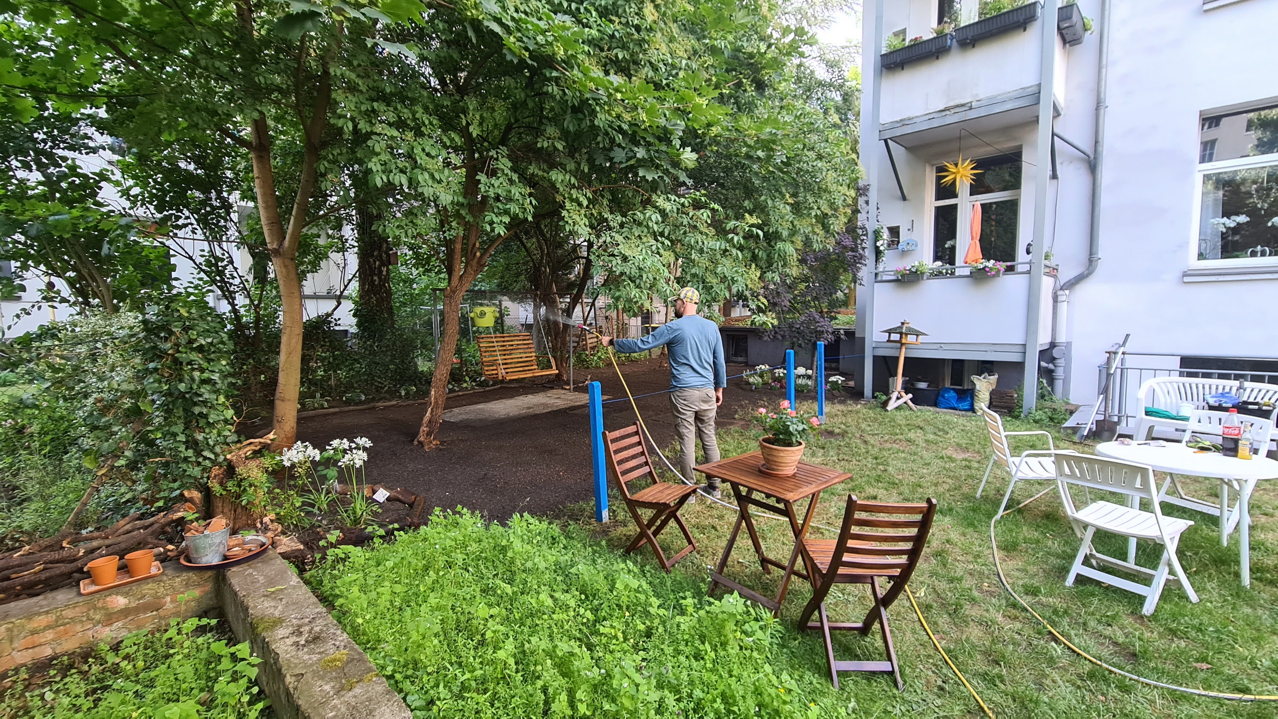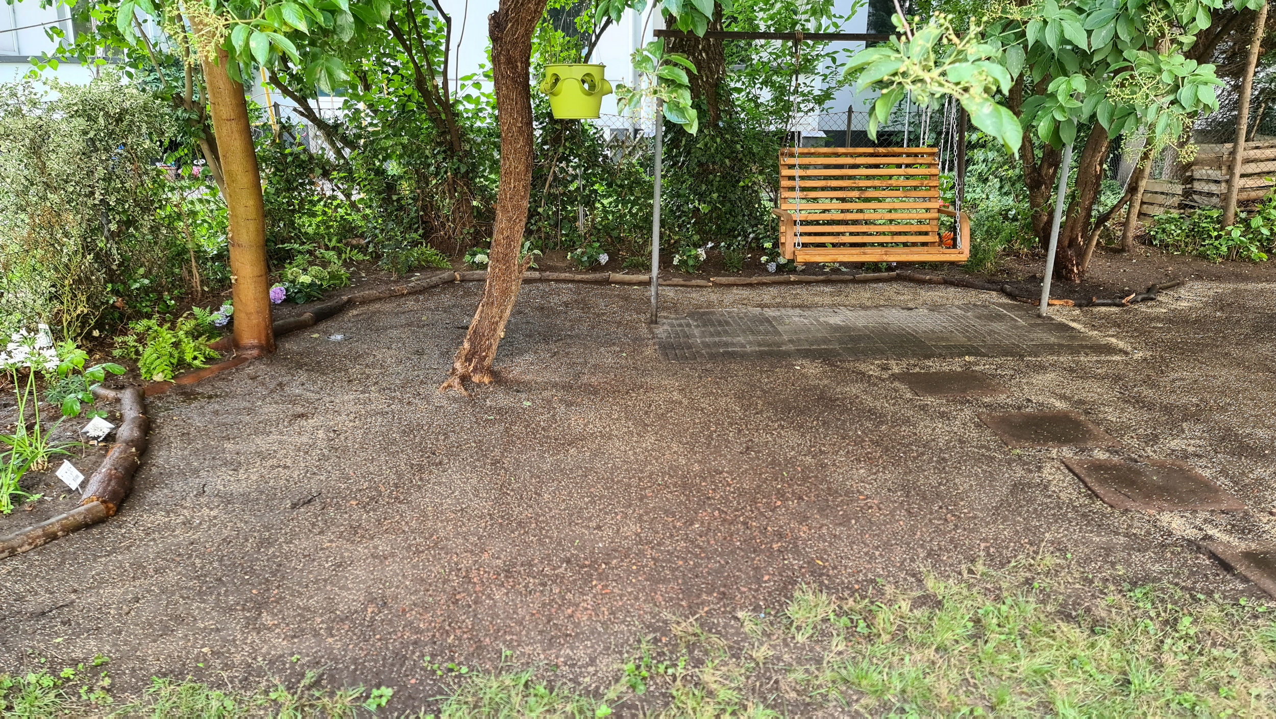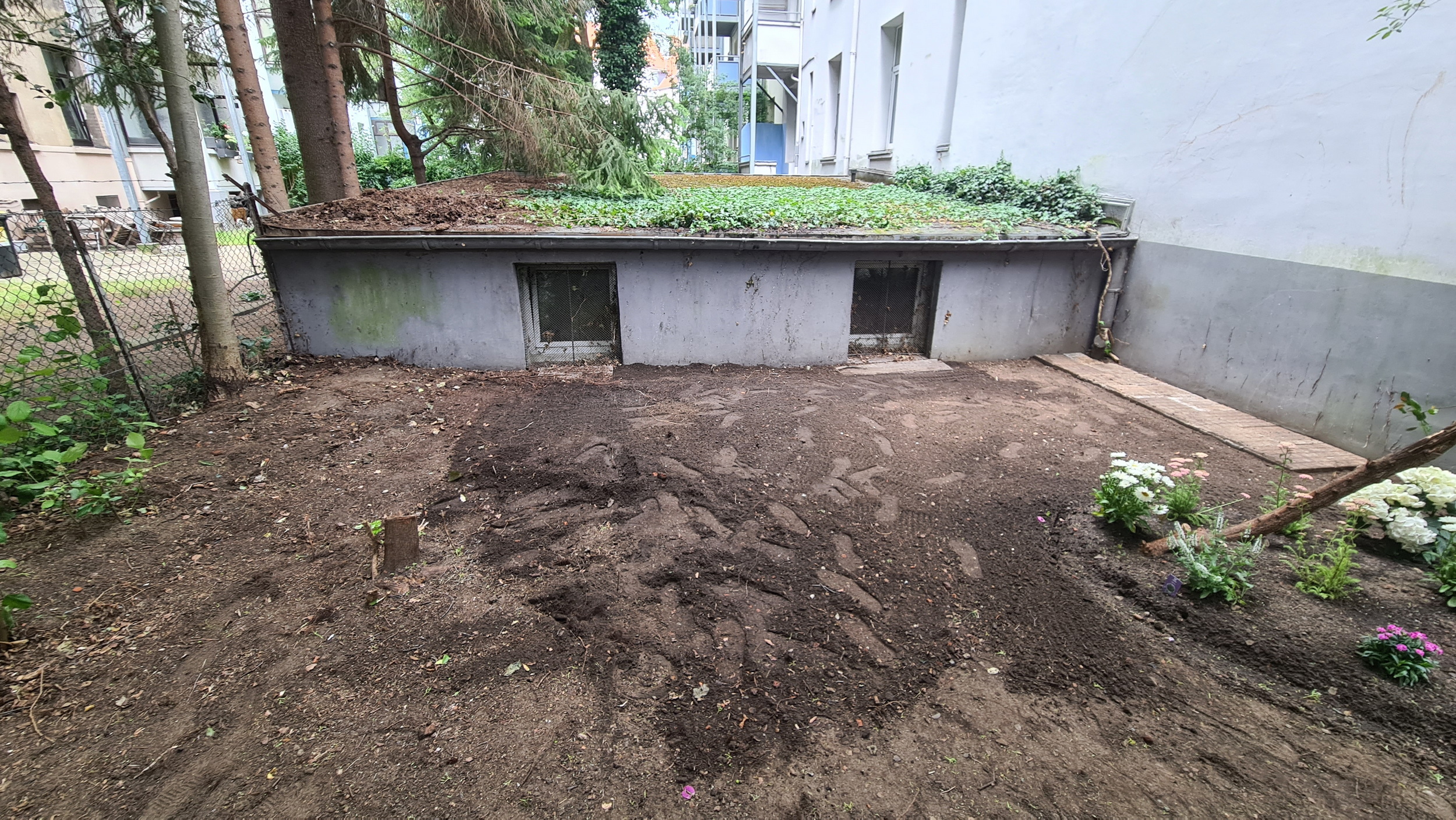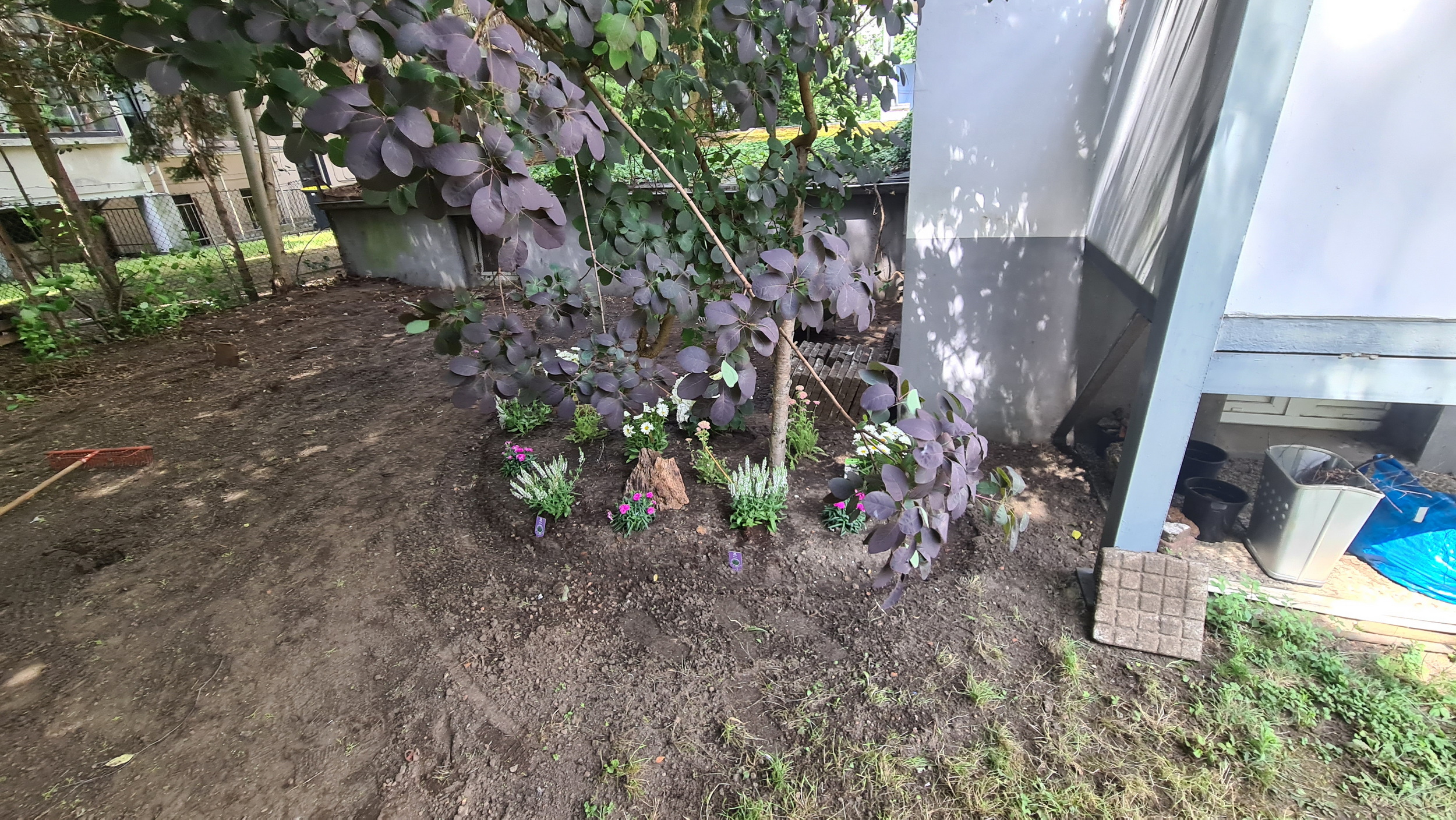 Nochmals Wurzeln und Steine entfernt, Platten verlegt, eingeebnet, geharkt, gewässert und zu guter Letzt den Rasen gesät.