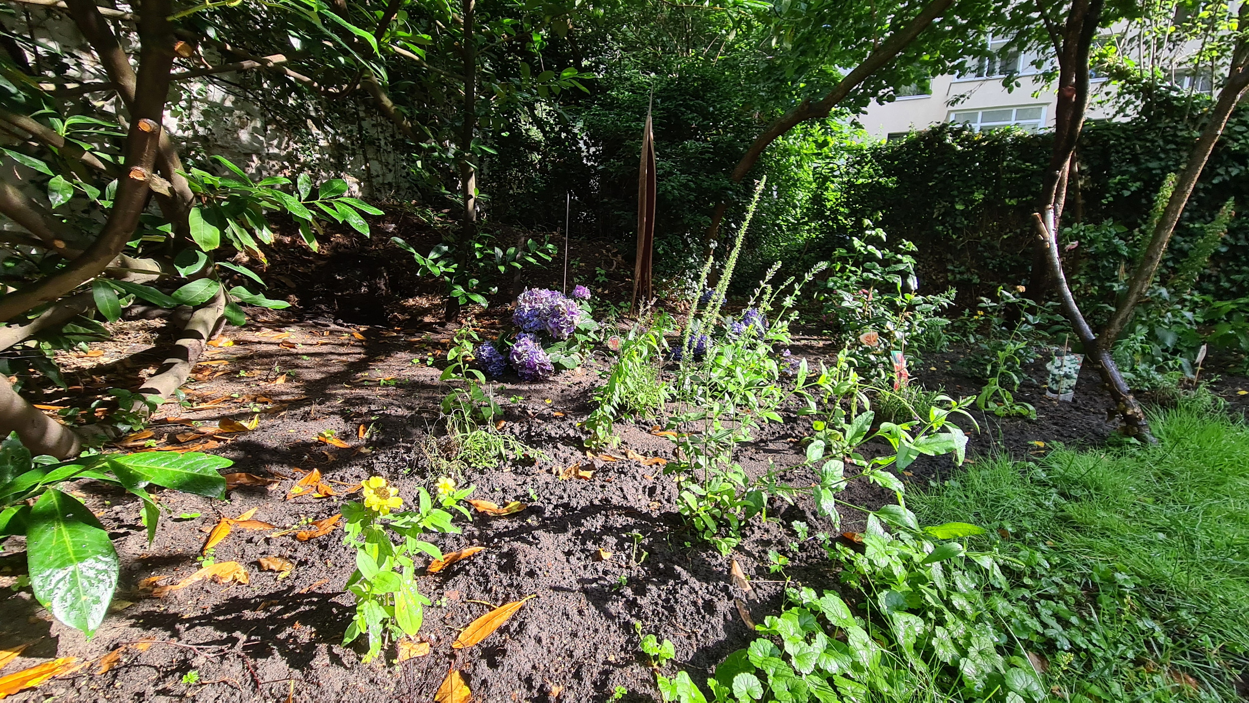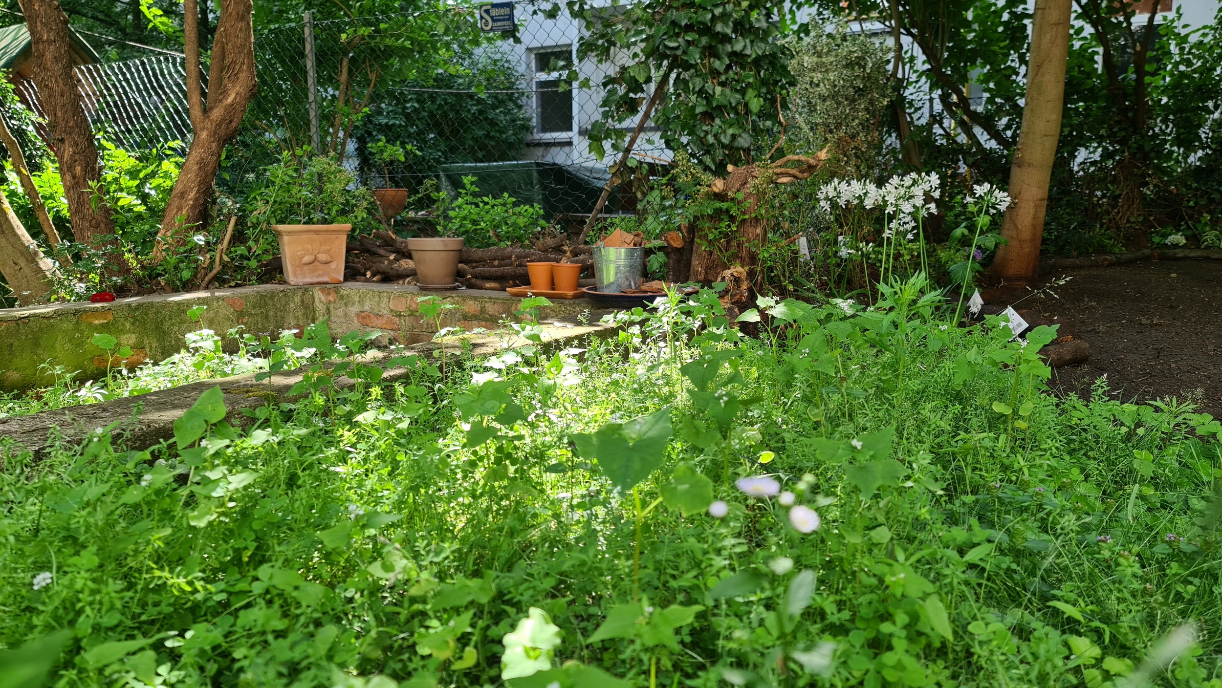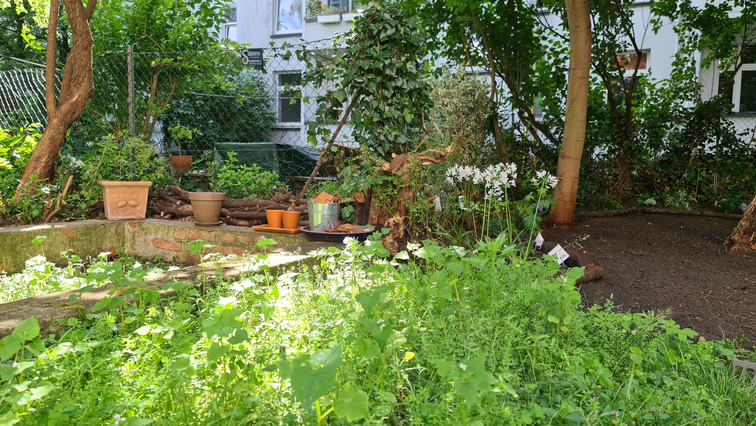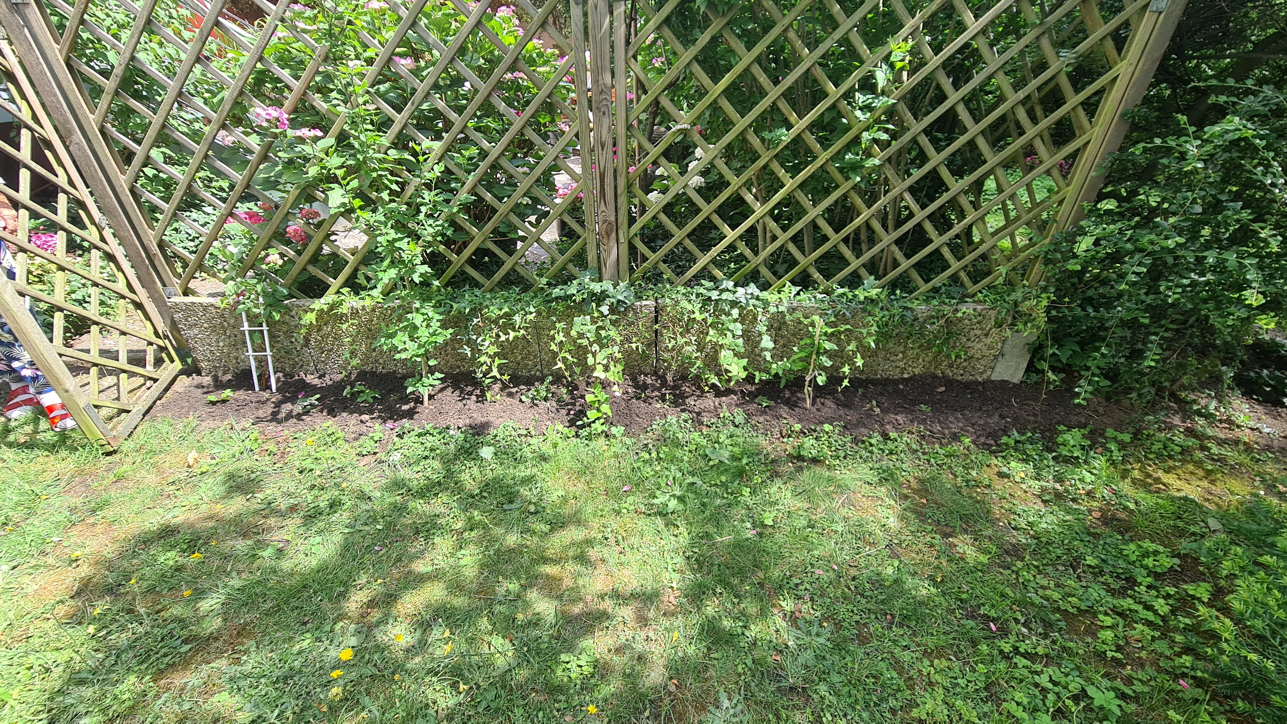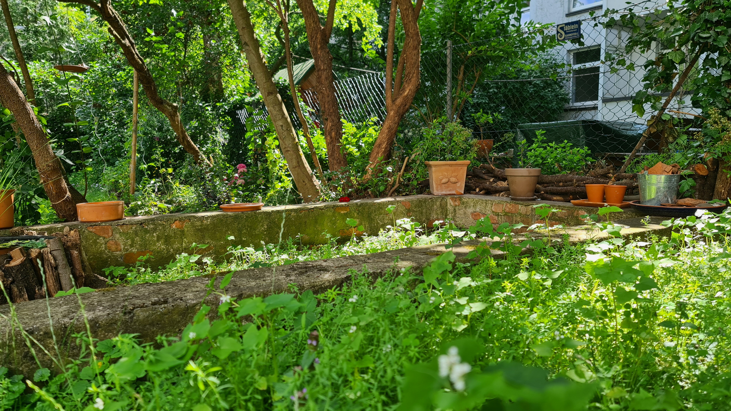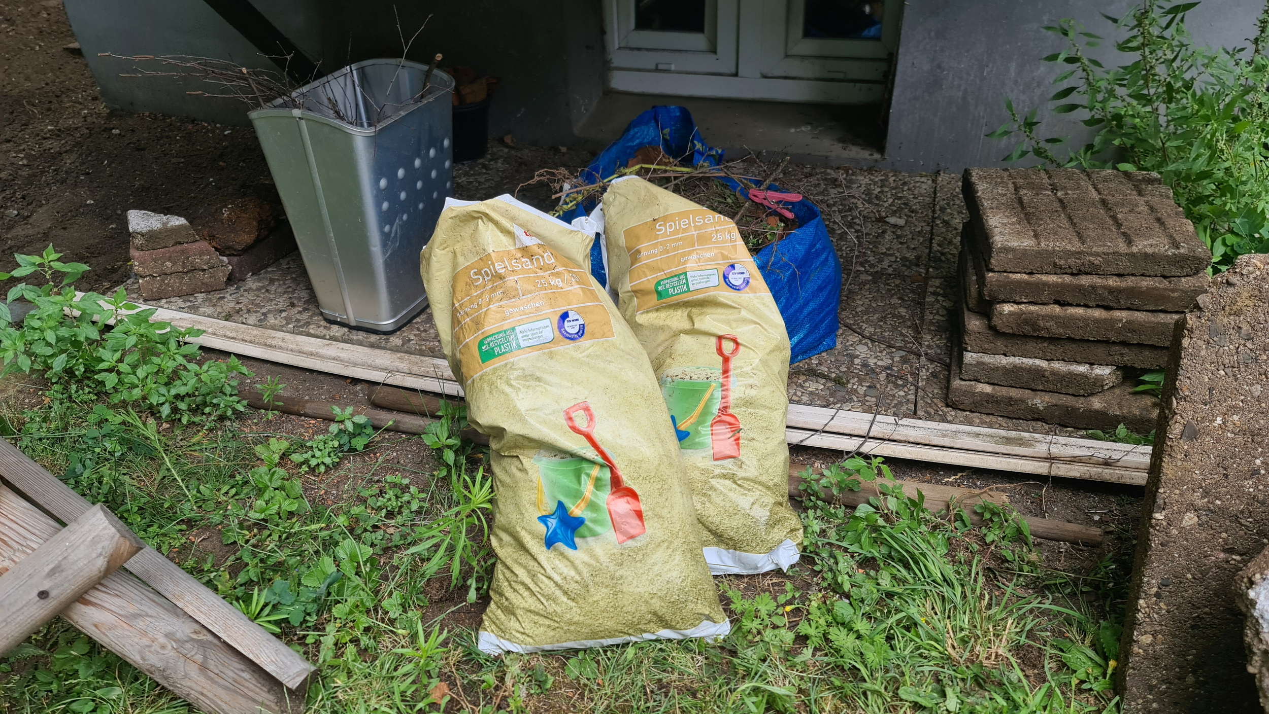 Nochmals Wurzeln und Steine entfernt, Platten verlegt, eingeebnet, geharkt, gewässert und zu guter Letzt den Rasen gesät.