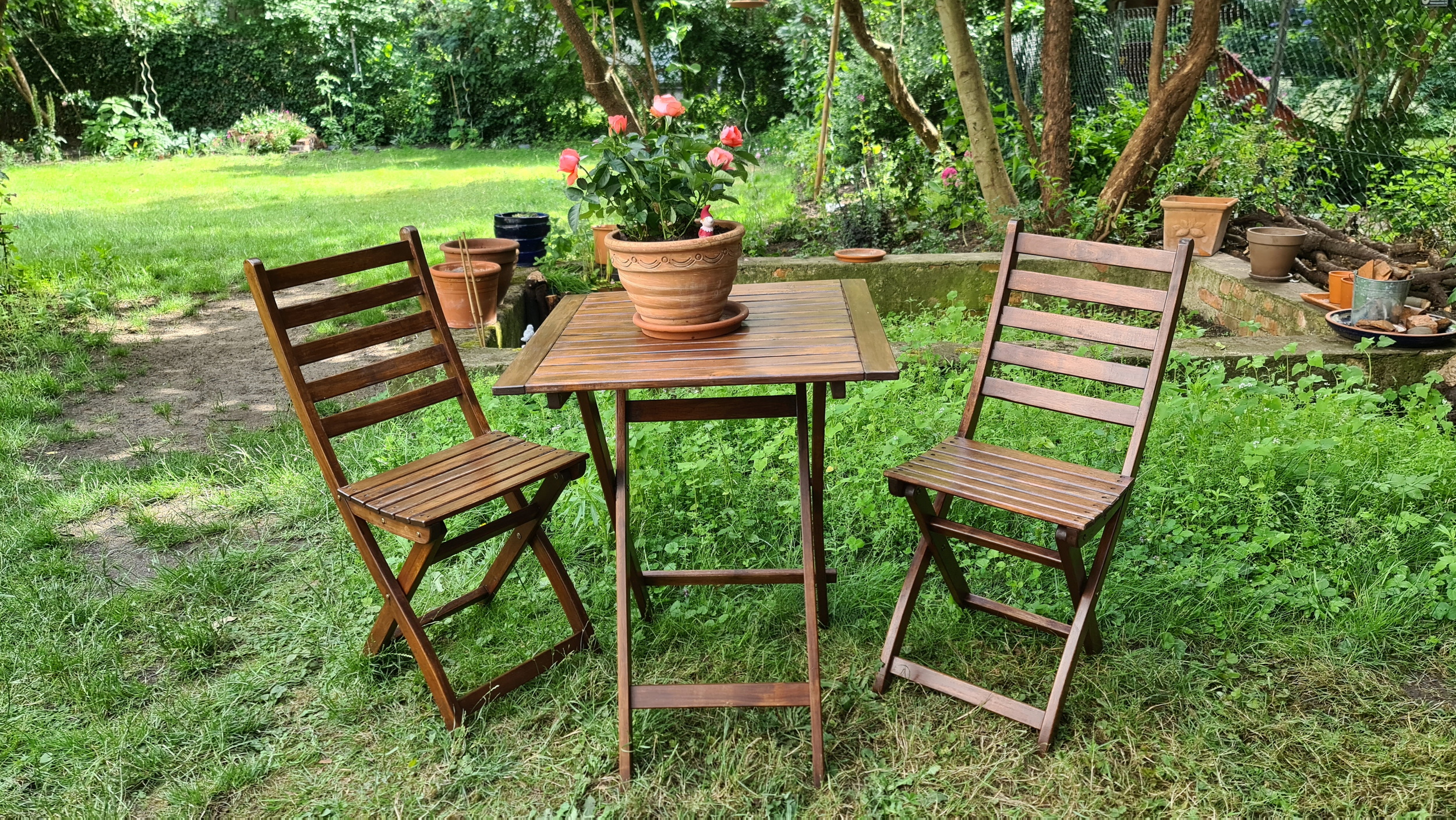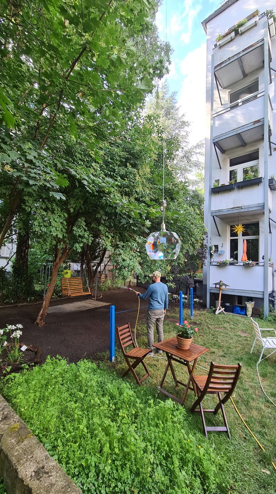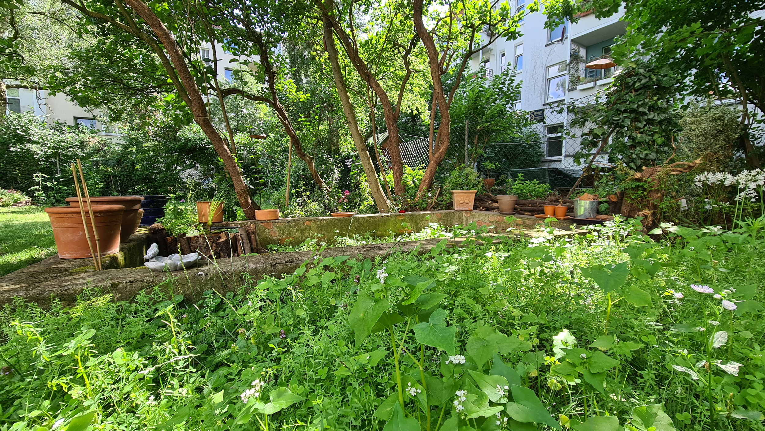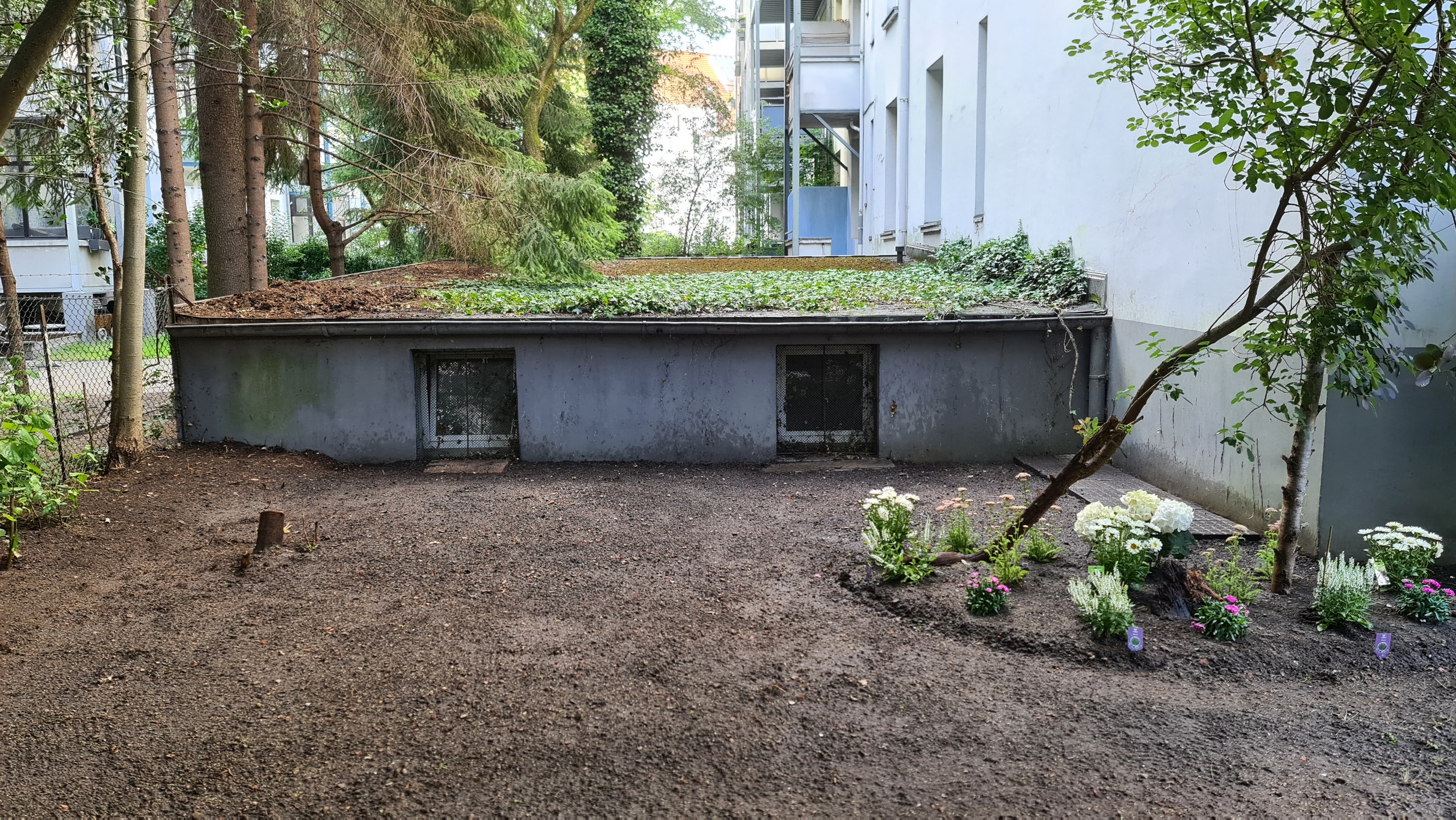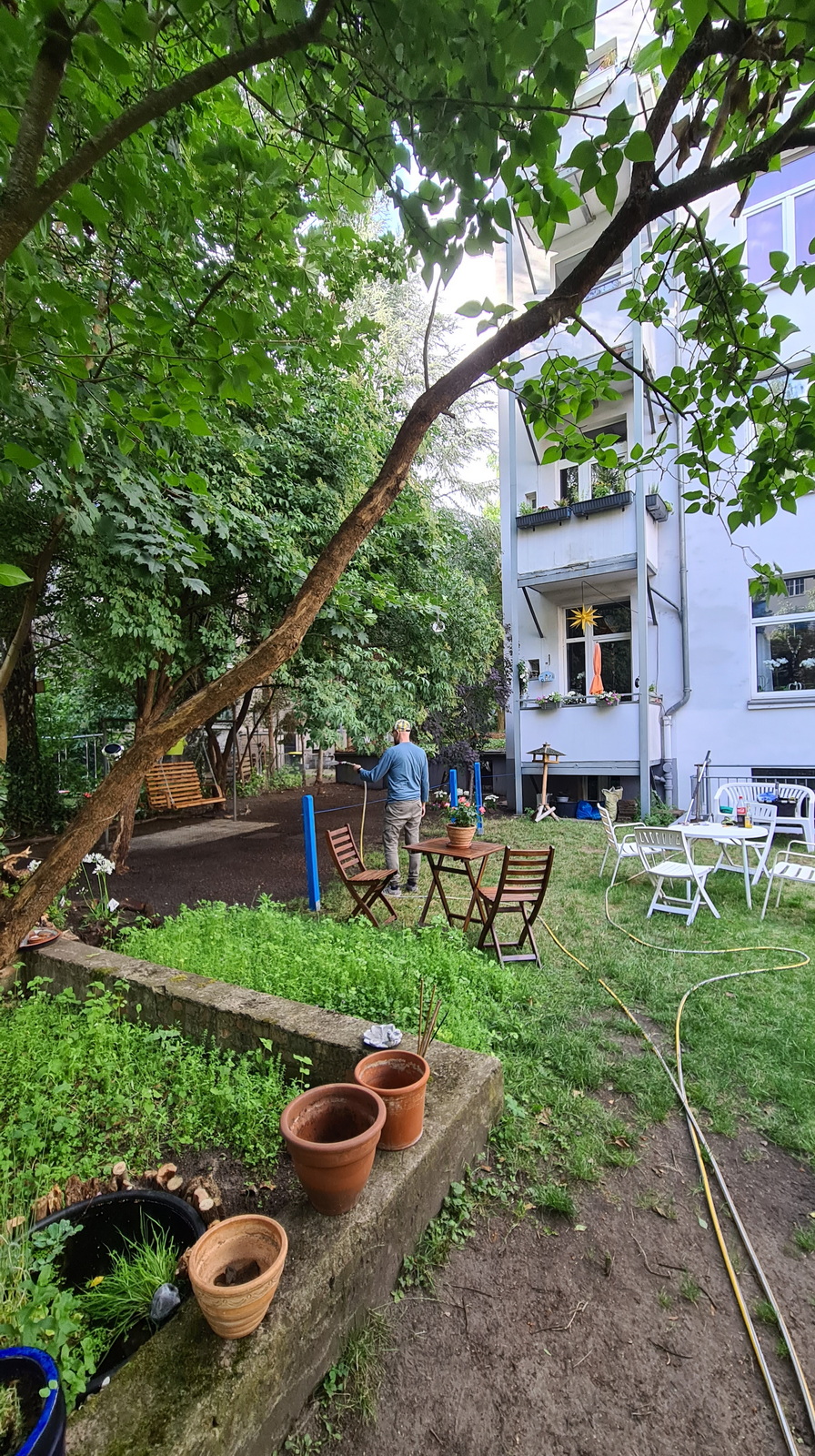 Nochmals Wurzeln und Steine entfernt, Platten verlegt, eingeebnet, geharkt, gewässert und zu guter Letzt den Rasen gesät.