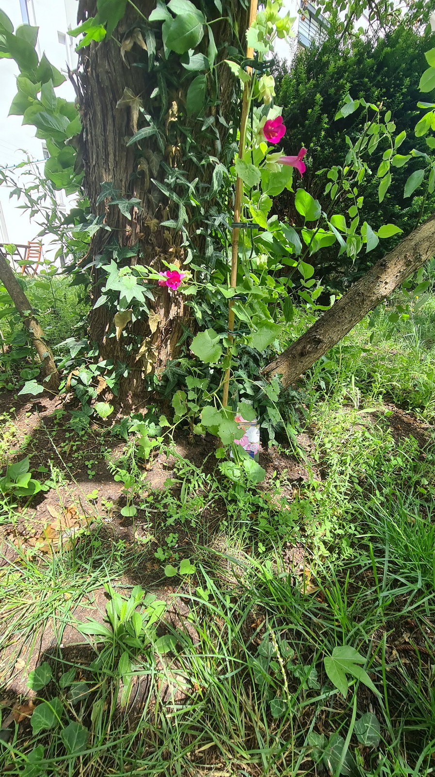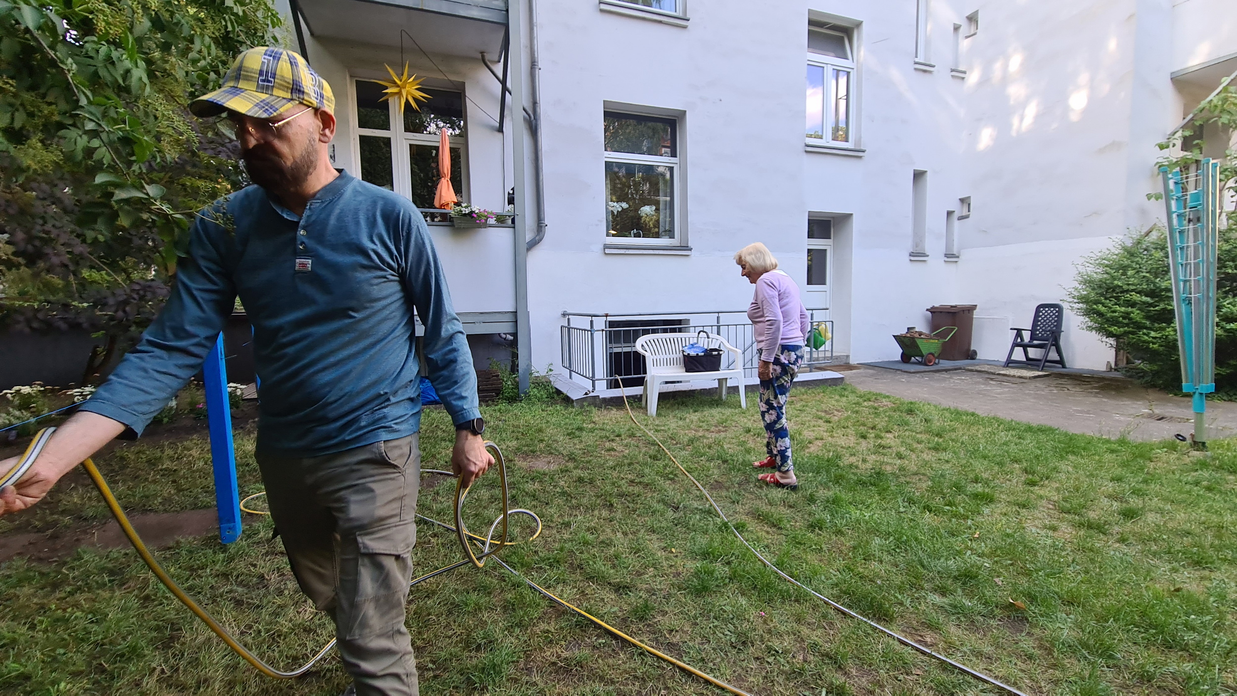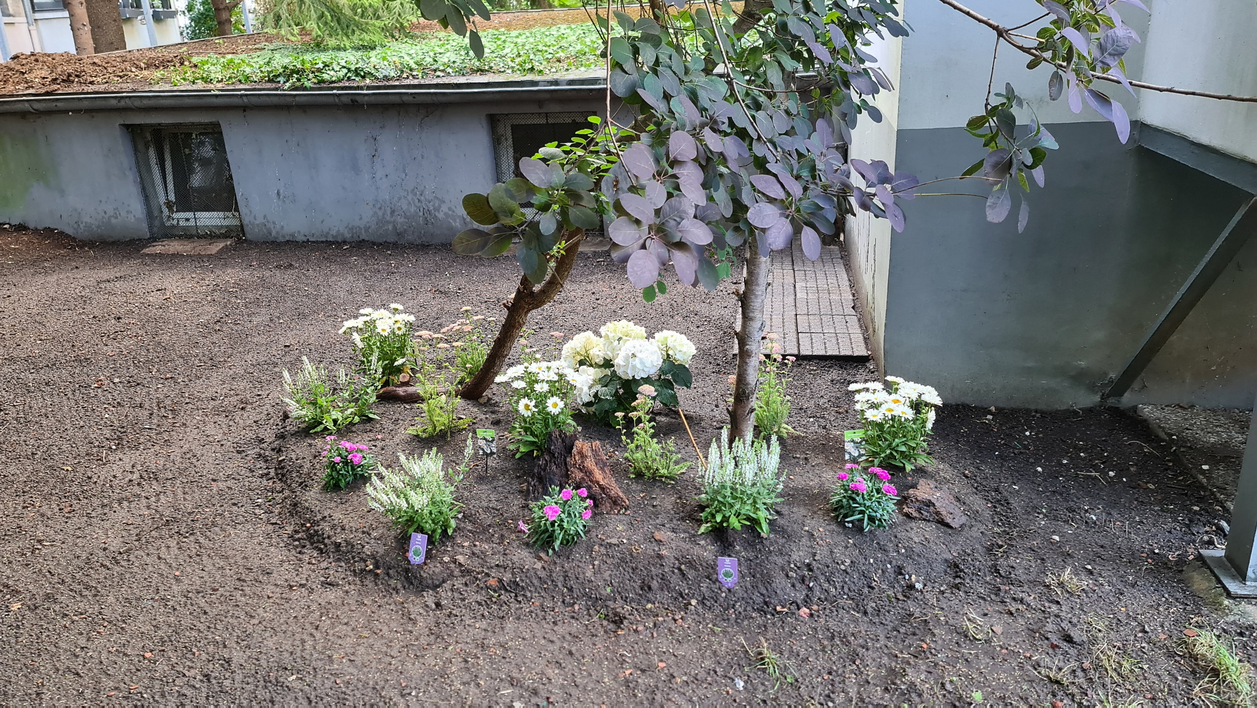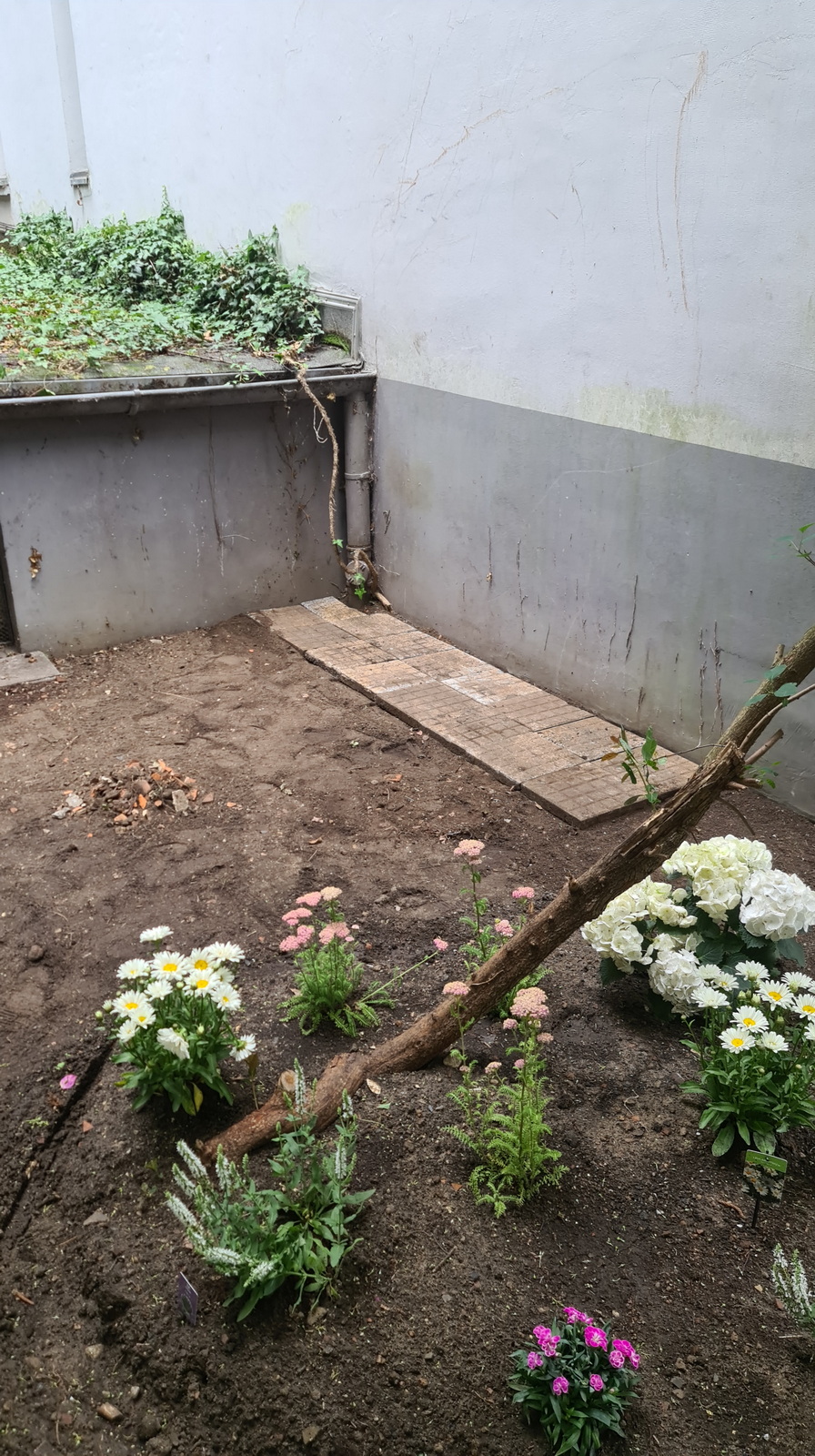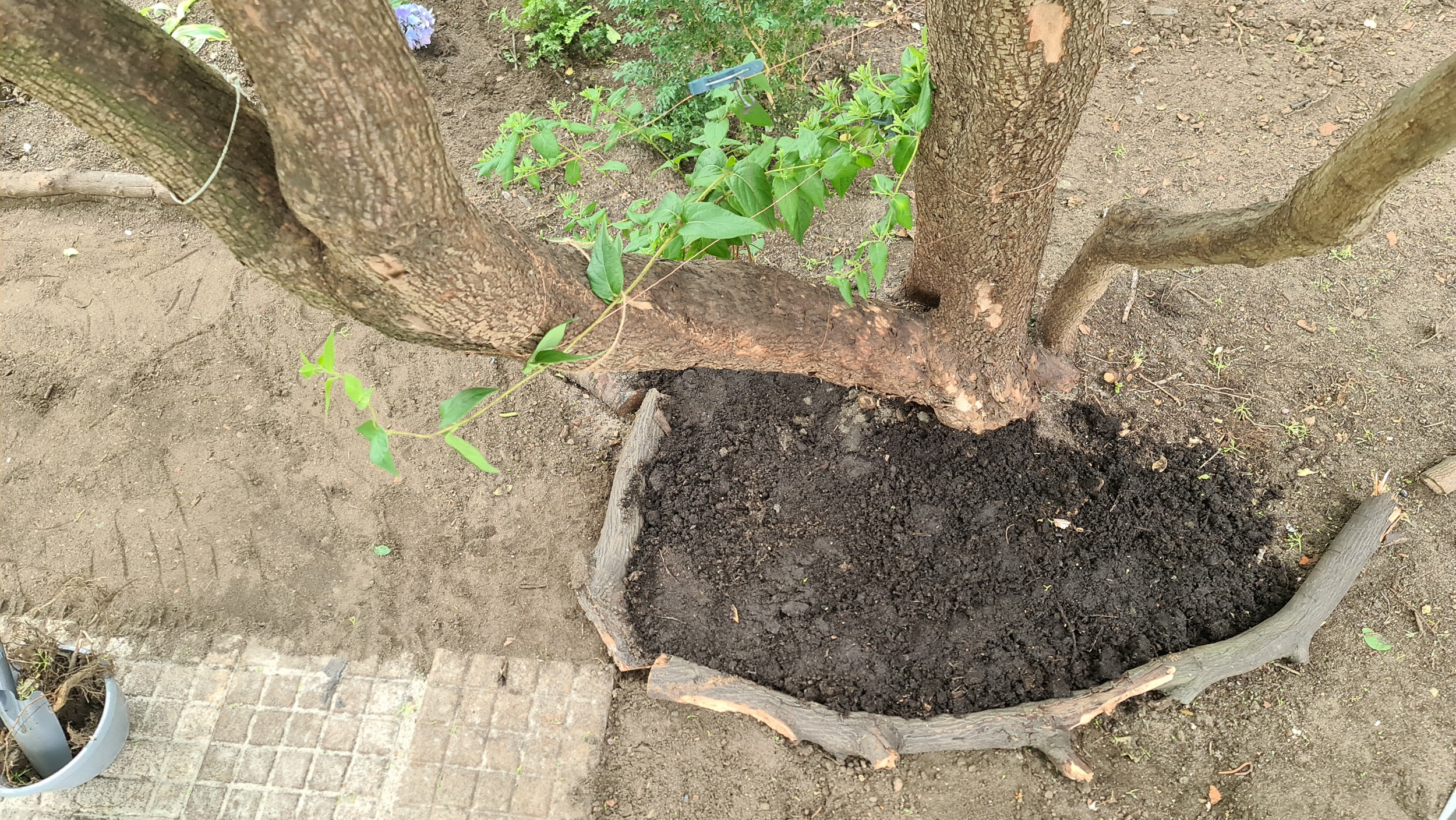 Nochmals Wurzeln und Steine entfernt, Platten verlegt, eingeebnet, geharkt, gewässert und zu guter Letzt den Rasen gesät.