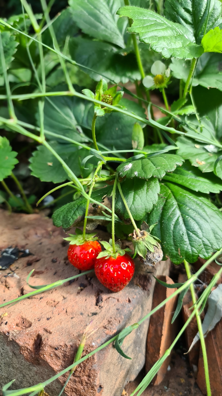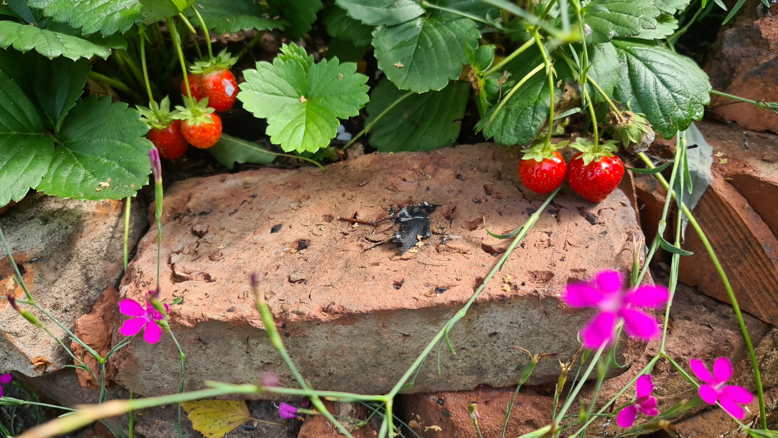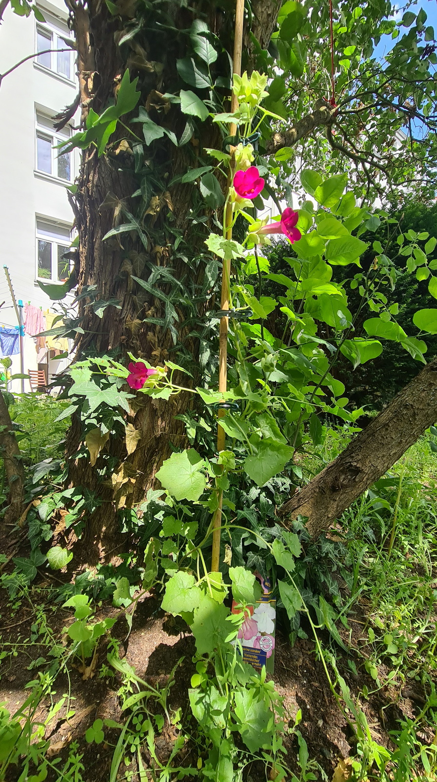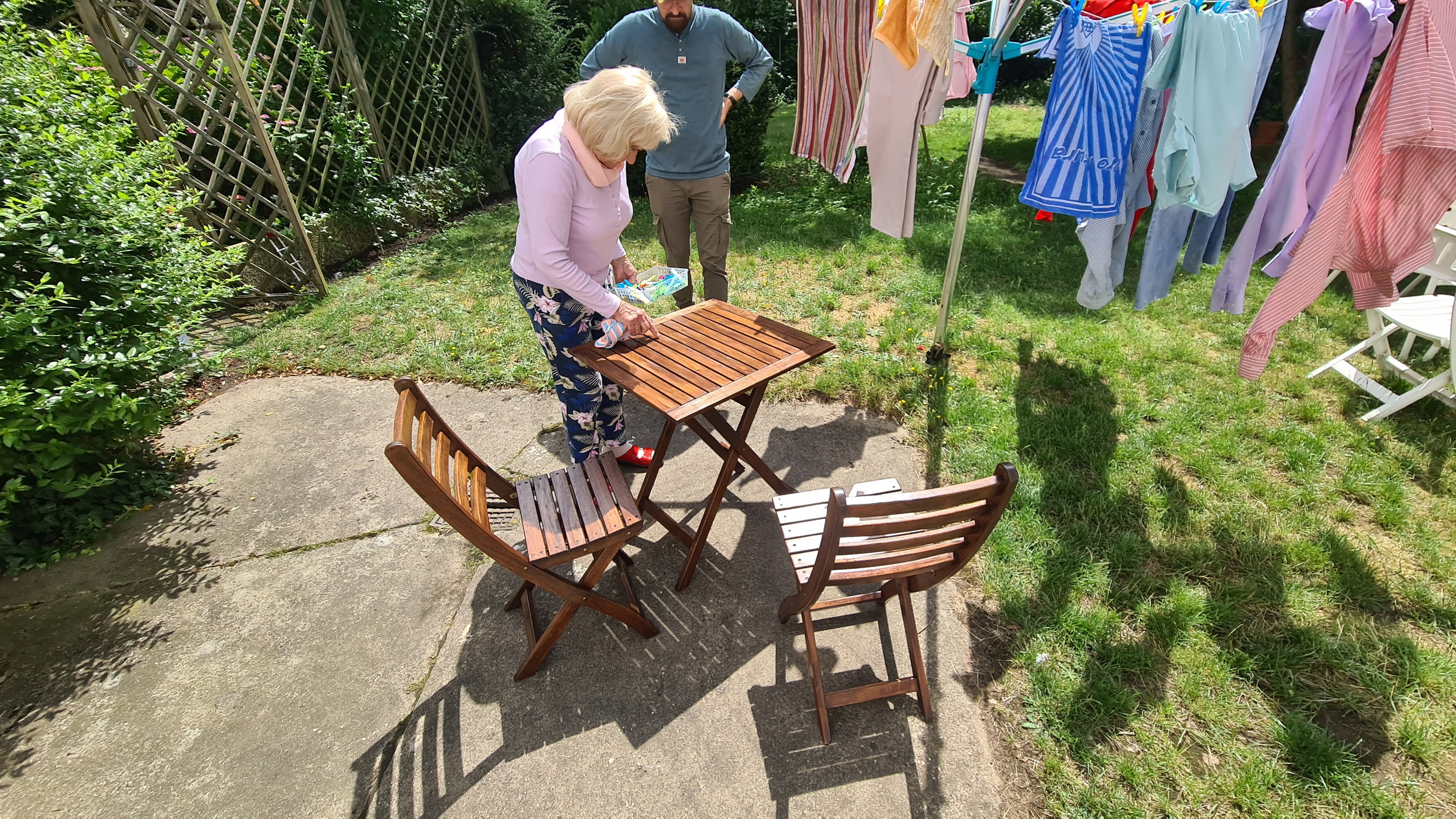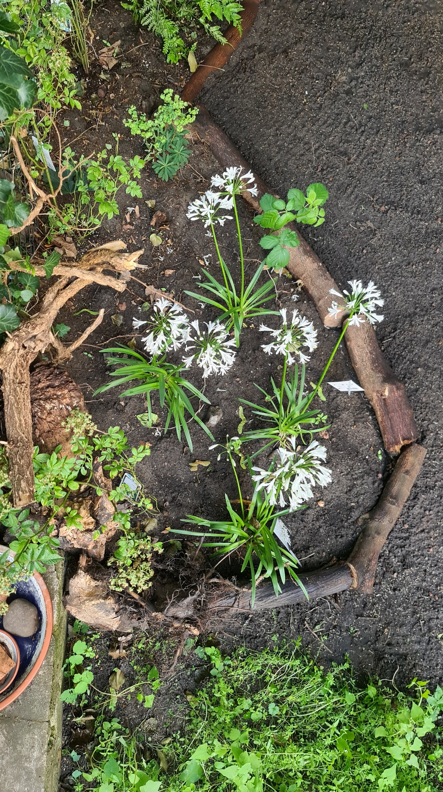 Nochmals Wurzeln und Steine entfernt, Platten verlegt, eingeebnet, geharkt, gewässert und zu guter Letzt den Rasen gesät.