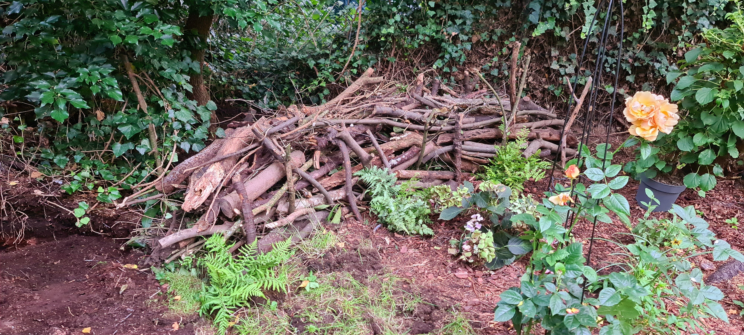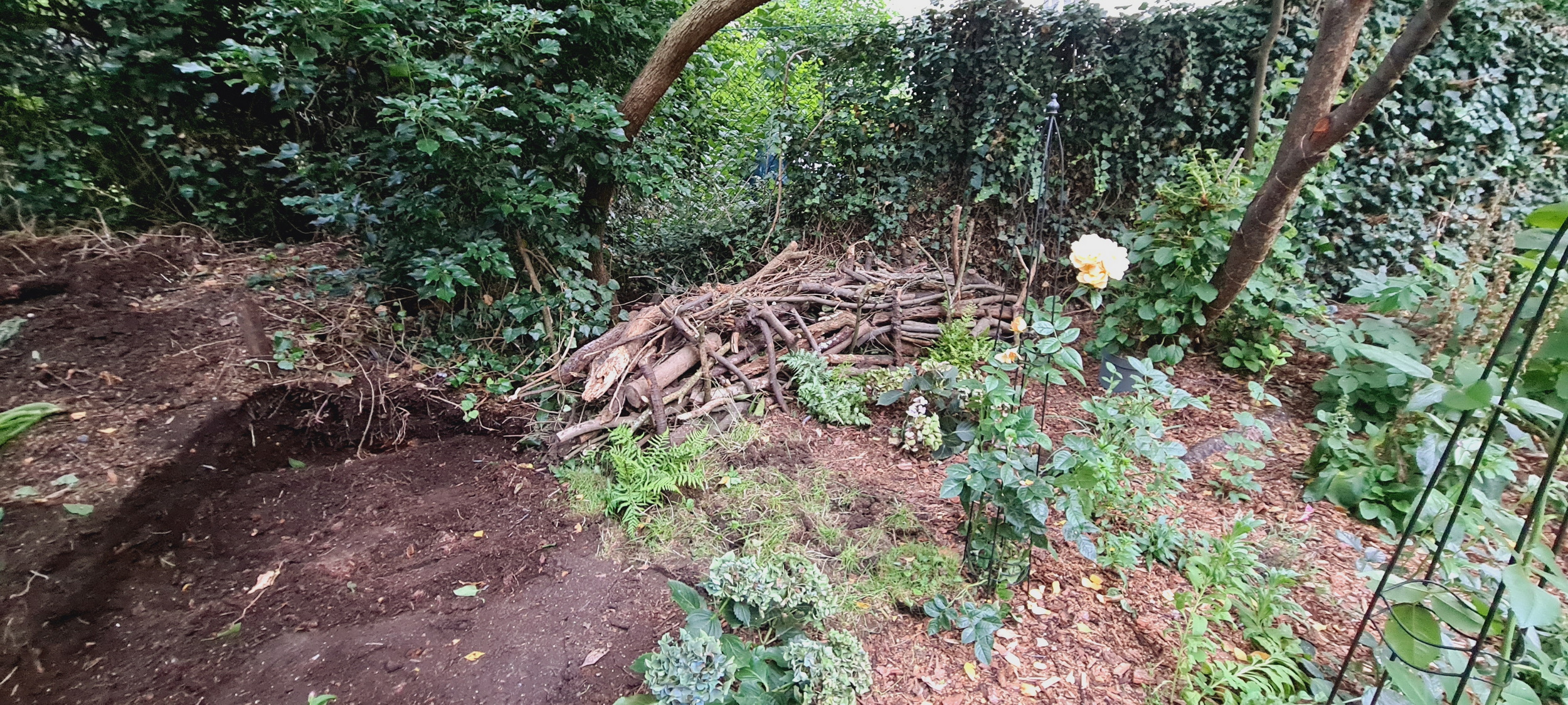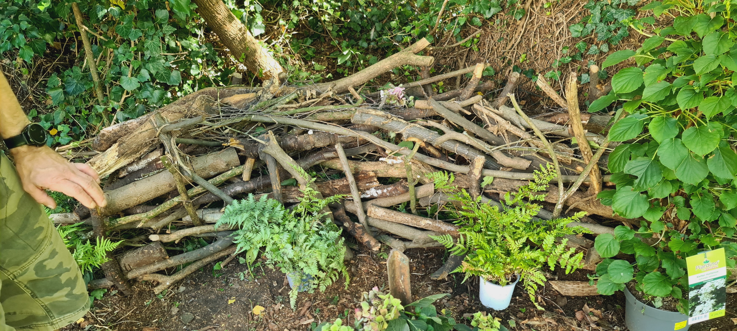 Die Totholzhecke hat Peter nochmal neu sortiert und mit Farn bepflanzt. Der Kompost nimmt auch Formen an.