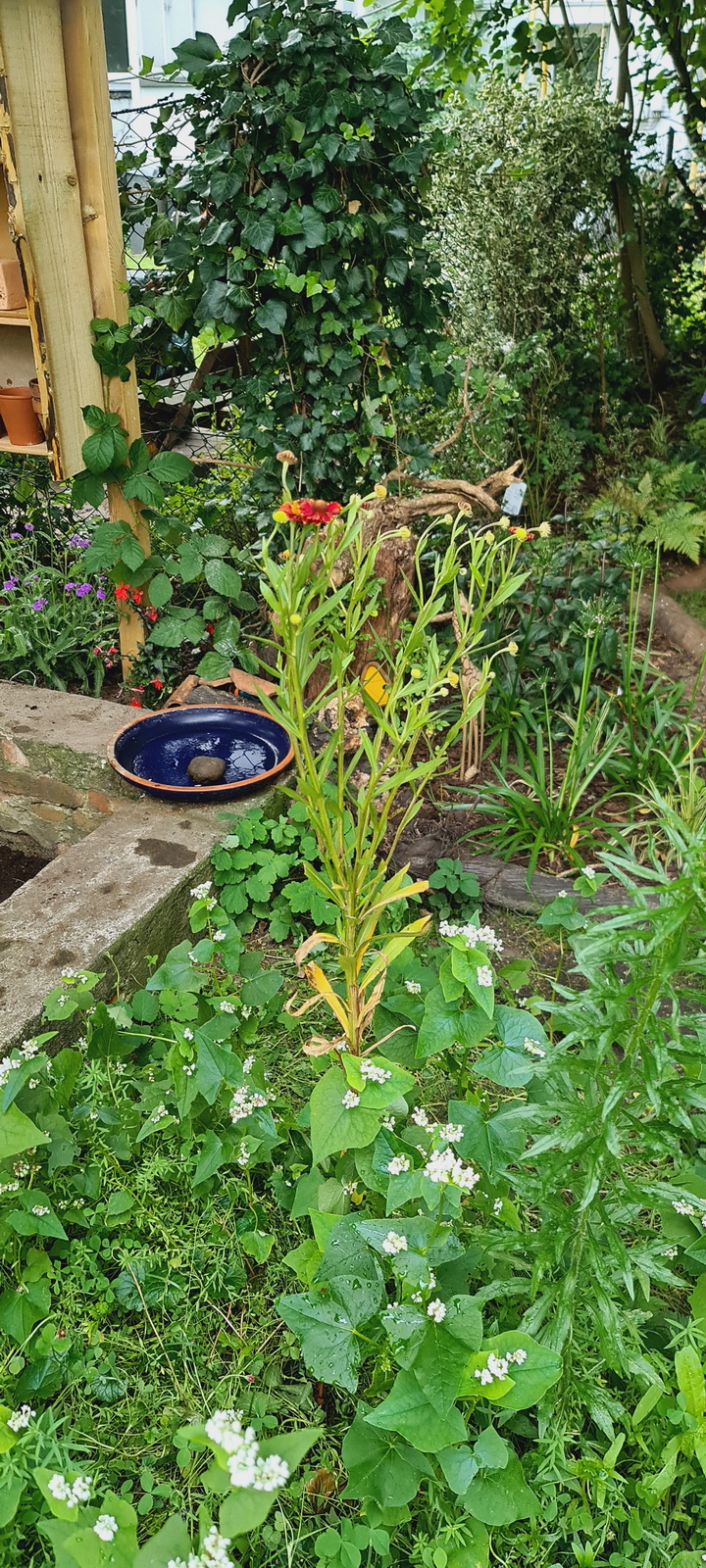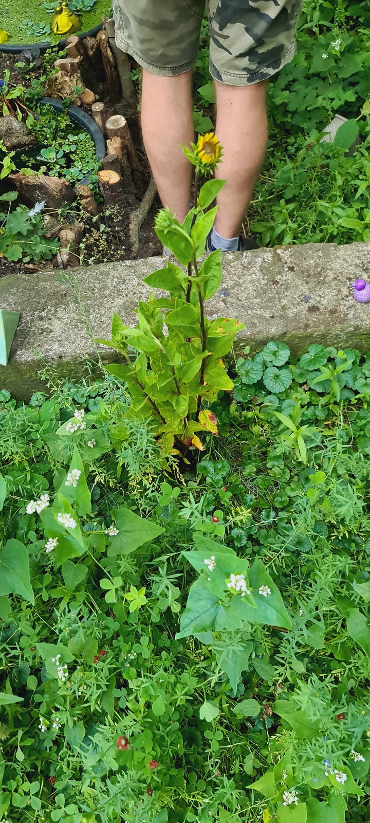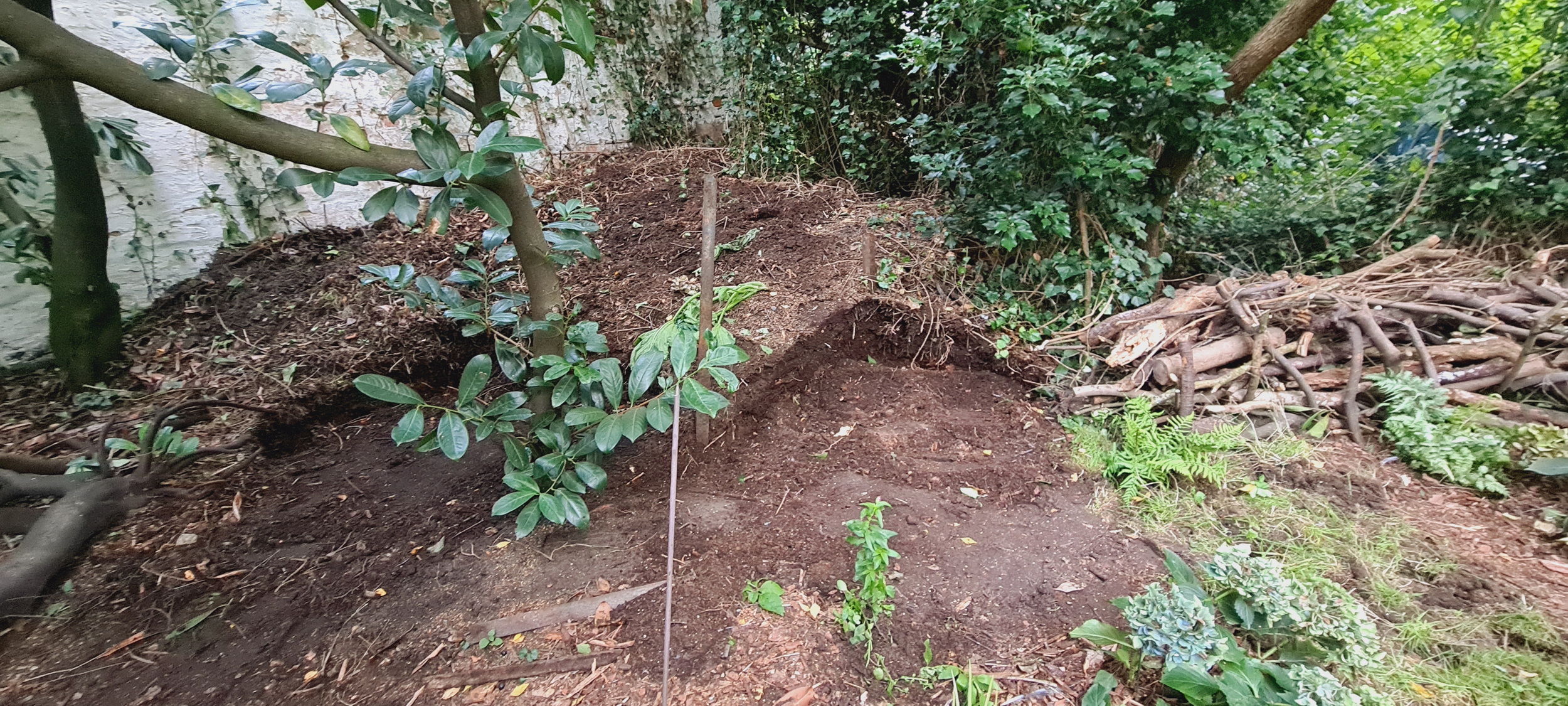 Die Totholzhecke hat Peter nochmal neu sortiert und mit Farn bepflanzt. Der Kompost nimmt auch Formen an.