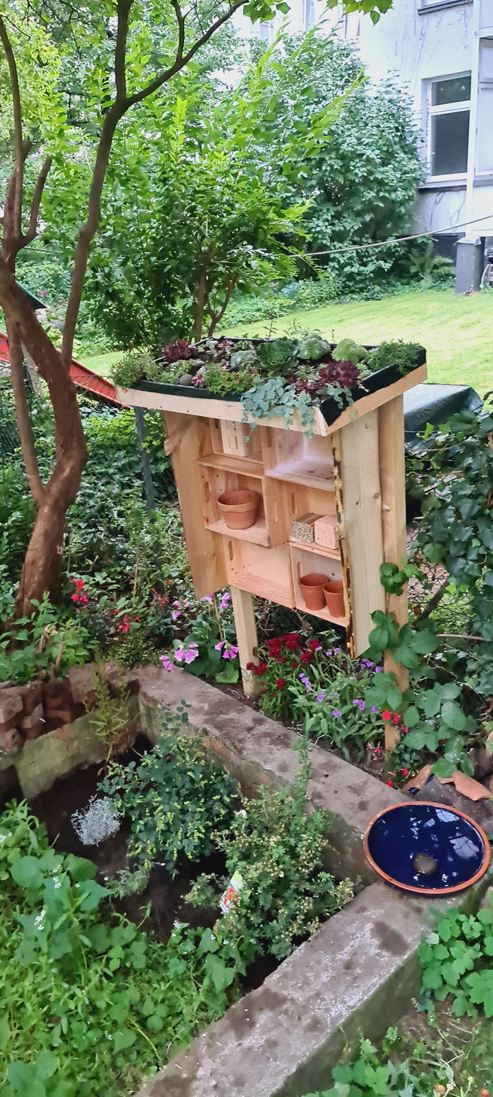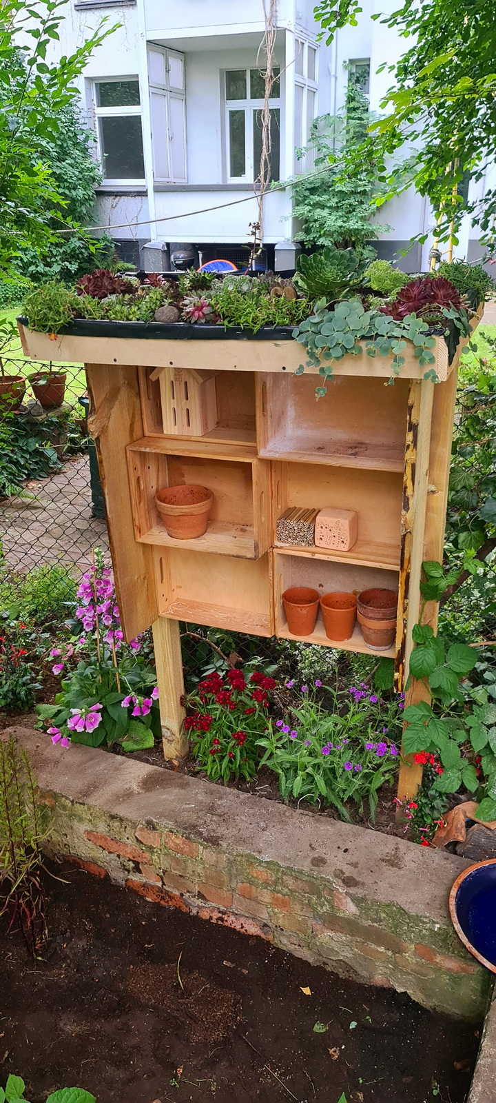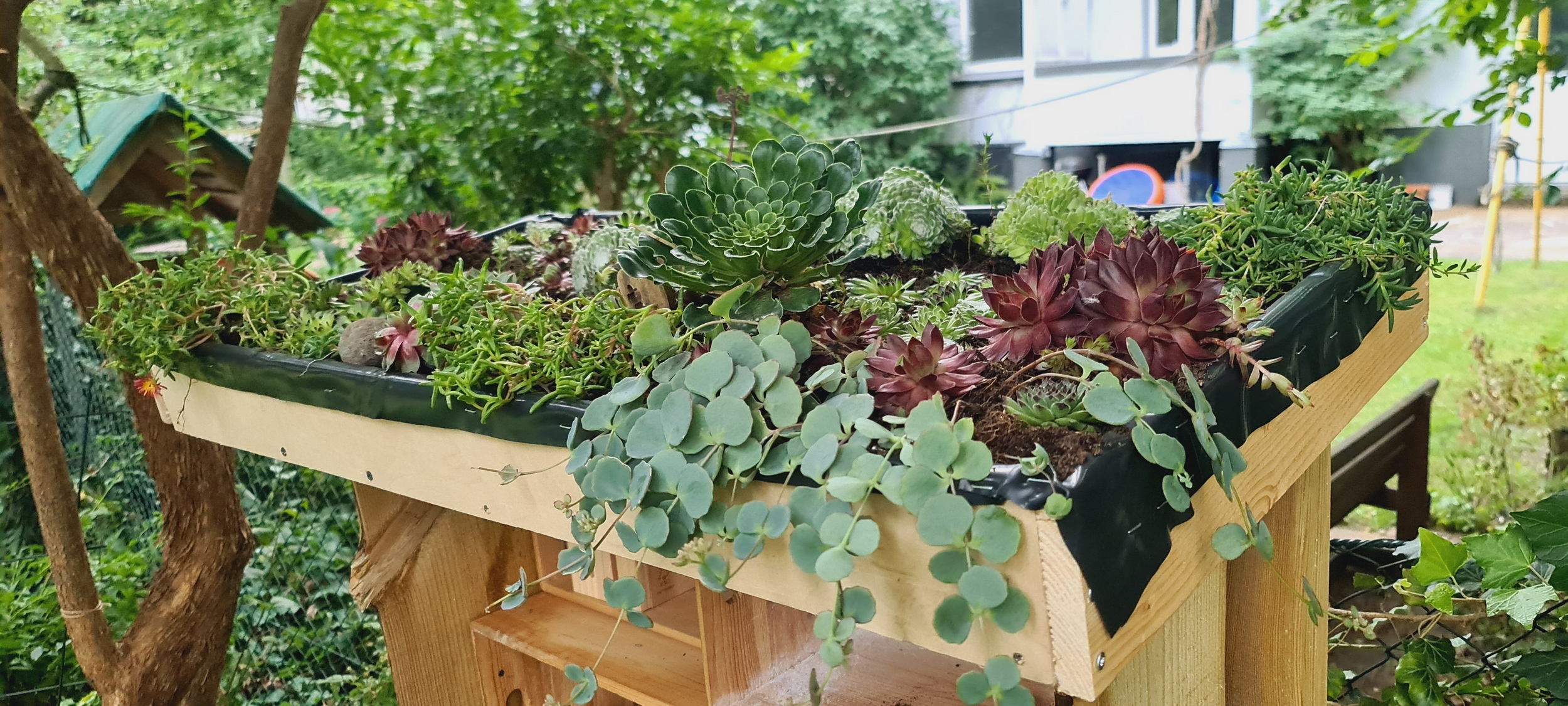 Das Insektenhotel ist fast fertig. Es hat heute ein Dach bekommen, welches wir aus der alten Pflanzwand konstruiert, wasserdicht und bepflanzbar gemacht haben. Gleich mit guter Erde aus dem Kompost aufgefüllt und mit Sukkulenten besetzt.