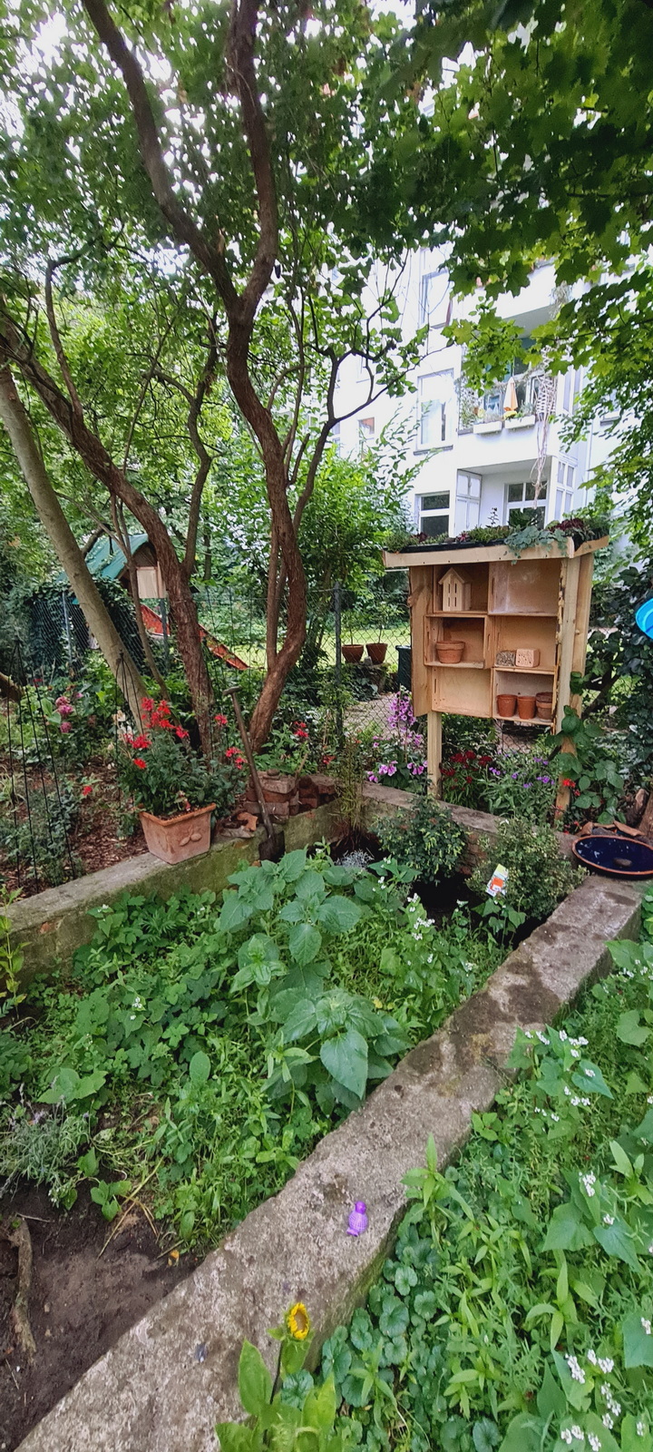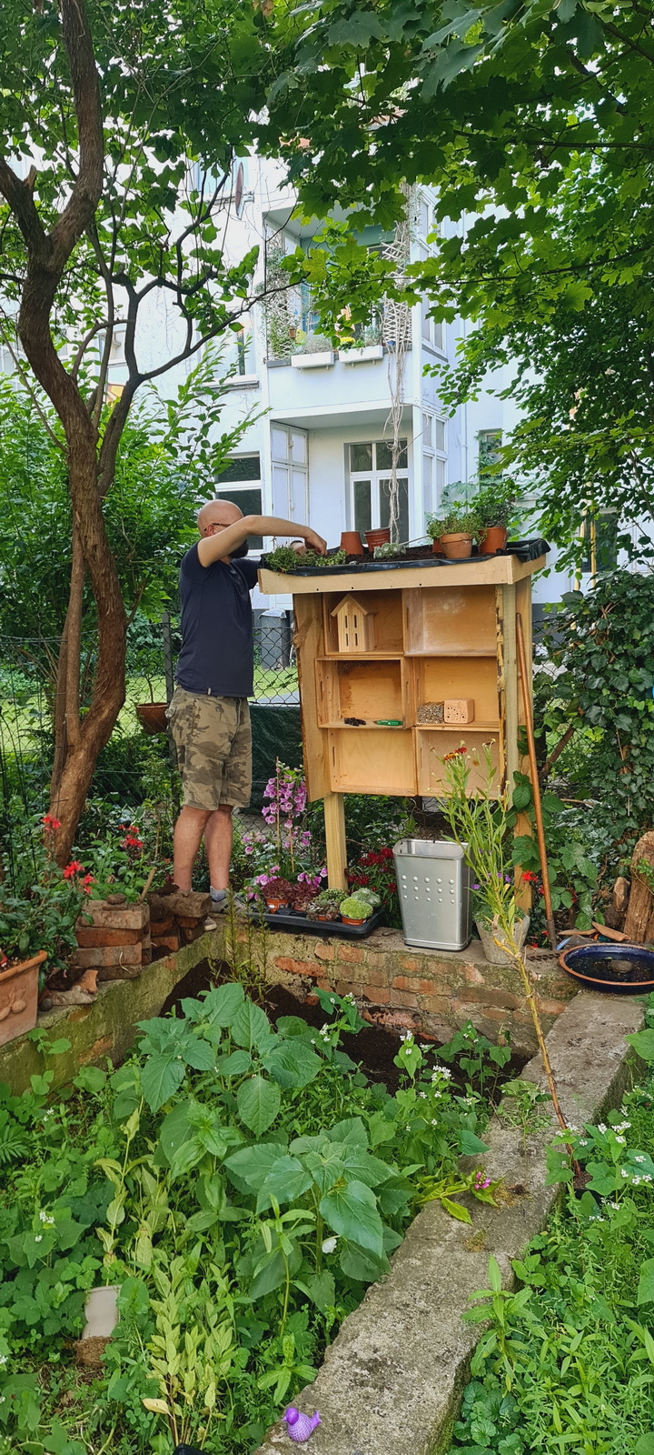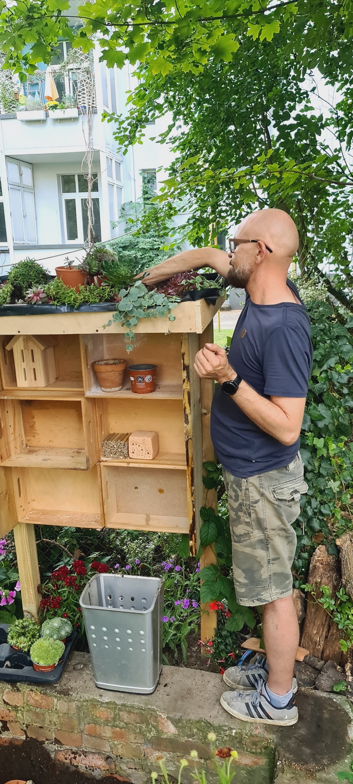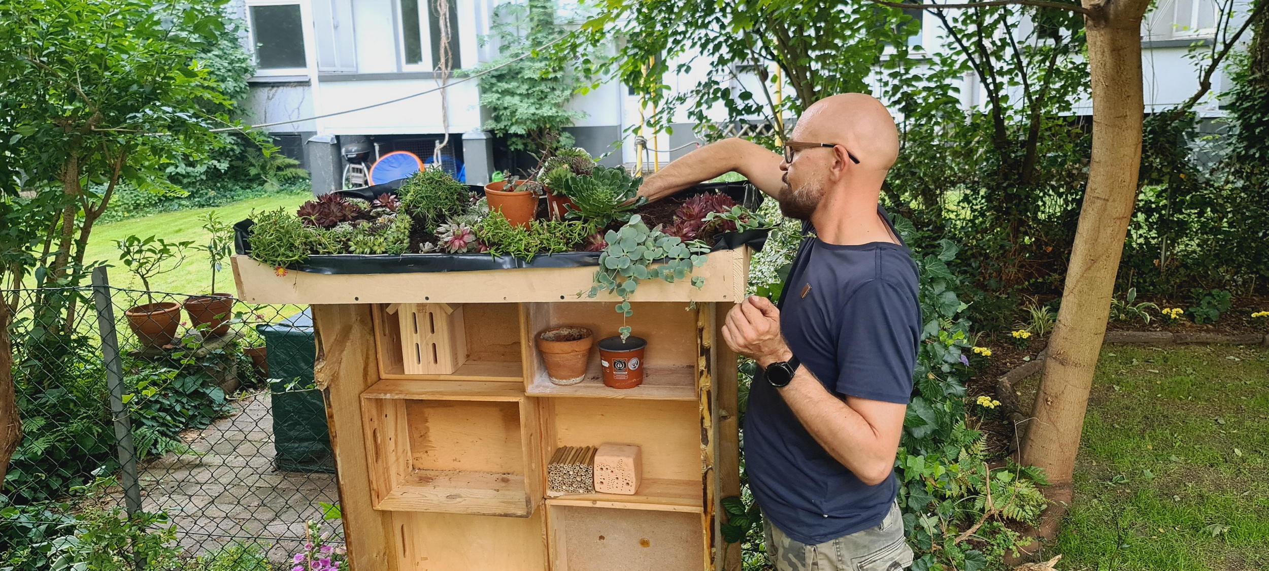 Das Insektenhotel ist fast fertig. Es hat heute ein Dach bekommen, welches wir aus der alten Pflanzwand konstruiert, wasserdicht und bepflanzbar gemacht haben. Gleich mit guter Erde aus dem Kompost aufgefüllt und mit Sukkulenten besetzt.